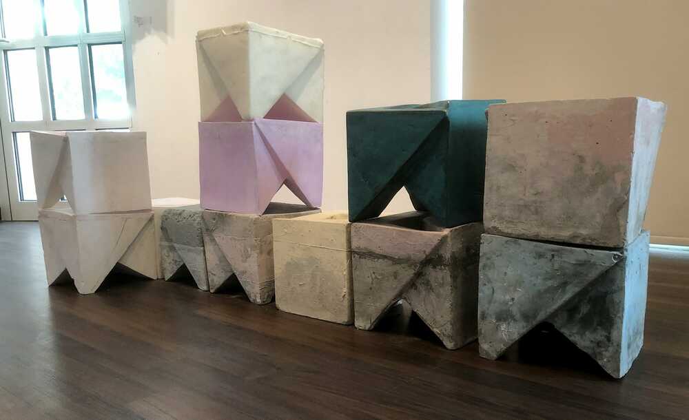 the cuboid-like shape is a modified Platonic volume. It becomes a module in an architectural structure or a setting that can be hidden or visible. Inspired by the traces of old buildings one might find in an ancient place, the installation calls to mind how these crumbling individual components now only serve as silent witnesses. However, at one time may have been the key element of a wall, or ceiling, etc. Regardless of their prior functionality, the aesthetic potential overrides the previous story
