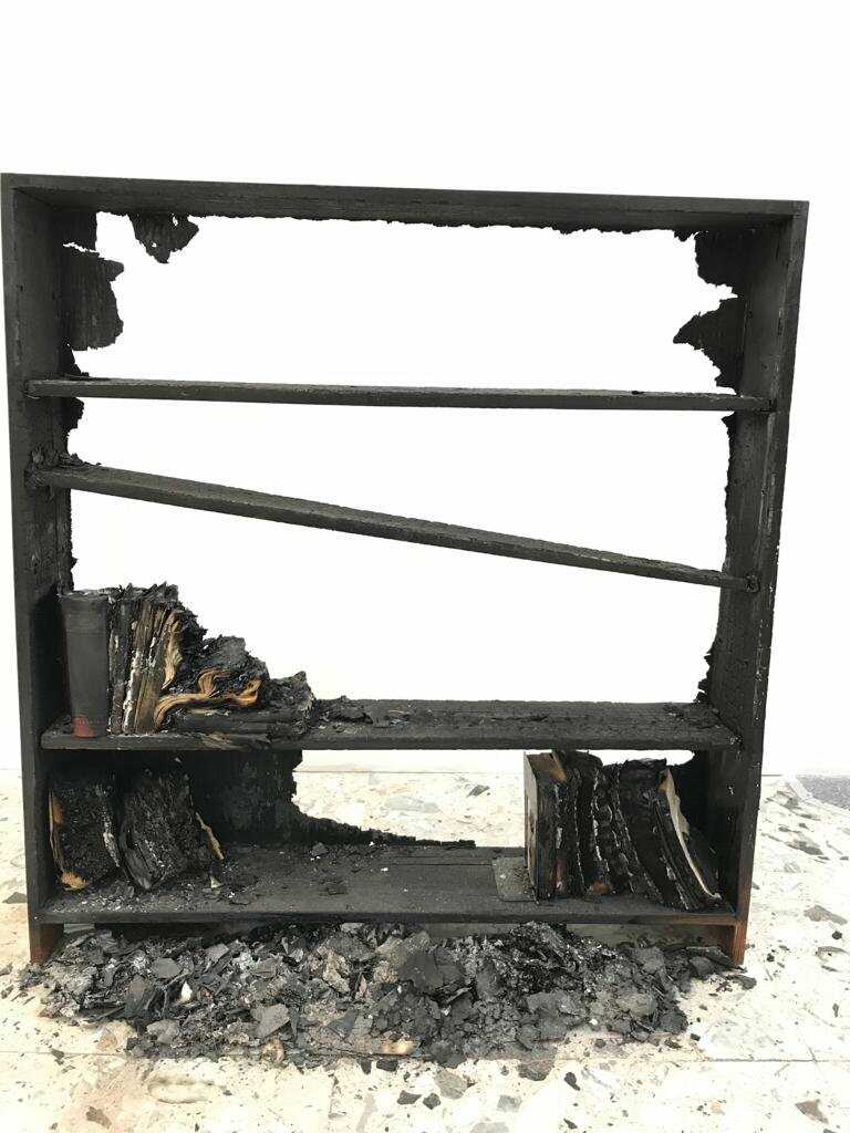 Libraries have been purposely burnt for centuries; to try to obliterate identities and to conquer. This continues today, but does not work. This is a burnt bookcase, part of an installation.