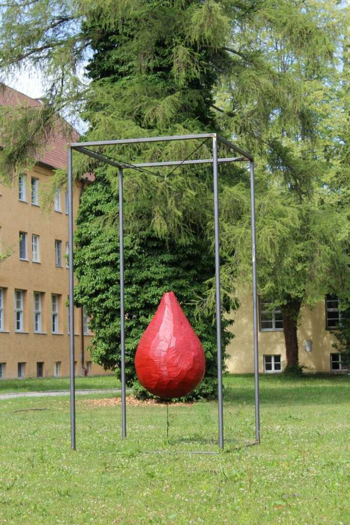 Ein Tropfen aus Eichenholz und Farbe der an Polyesterseil in einem Stahlkubus hängt