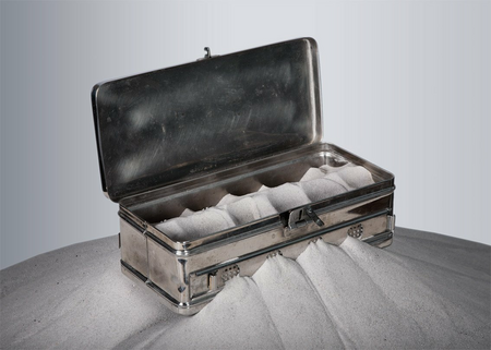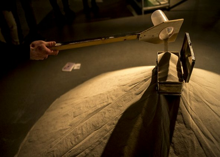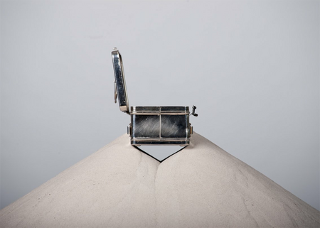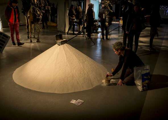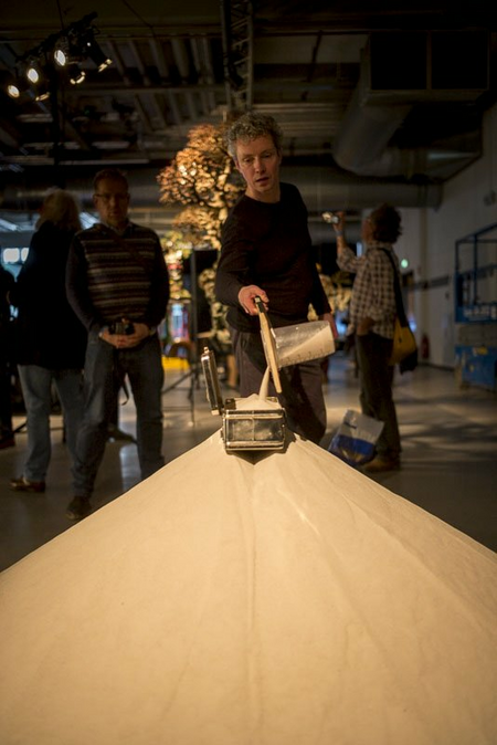 The mountain of sand starts at the top in the box and find its way down through eight groups of circular orientated holes. The holes have their influence on the trail of the sand. The sand carries the box. The work is a metaphor for a hierarchy based society. A performance comments on the hierarchic system by taking sand from the lowest part and pour it into the box on top endlessly. The performance of over 20 hours took place at the "No Walls Expo" during the Rotterdam Contemporary Art Fair of 2016.