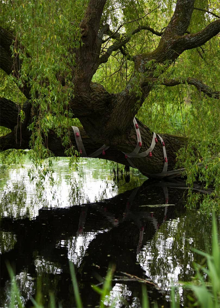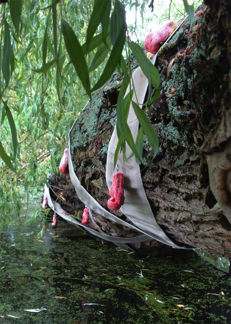 For the sculpture garden Ravesteyn a site specific work has been made. In memory of all the perished refugees at see a work about the dangerous journey. For a lot of people it is not a choice, but a way of survival. The work exists of a small boat with a proportional huge figurehead to enforce a save journey. No woodcarving but an original tree to hold on to life itself. The boat is connected with the tree by bandages, with fists as a variation on the Hamsa (protection) with Nazar (evil eye). The Hamsa are not suited for the weather influences and will drown.