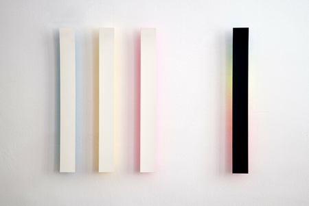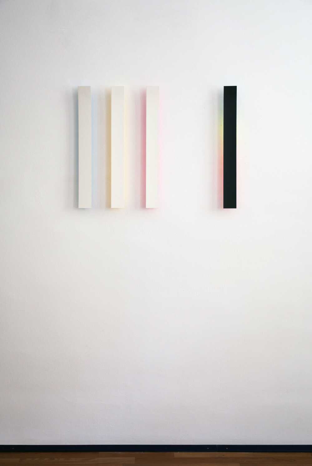 The wafer-thin strips hanging loosely on the wall and moving in the current of the air are pendent and emblematic of the fleetingness and immateriality of light.