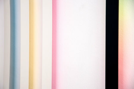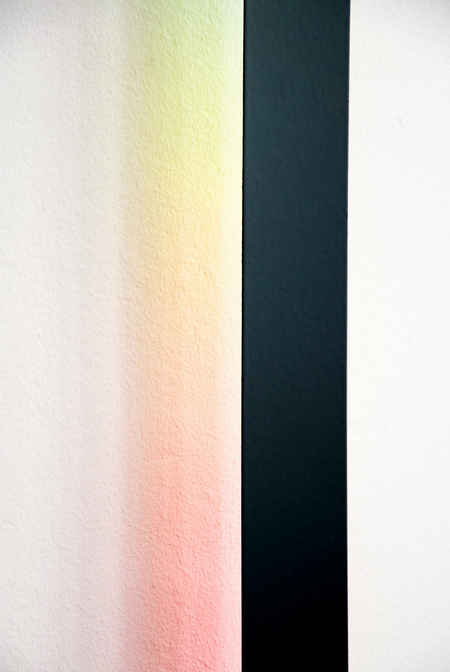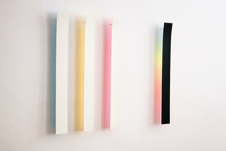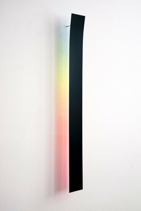 The strip has the primary colors painted on the back. Where they overlap, secondary colors emerge in the projection onto the wall. Together, they produce a color spectrum that is contained in daylight.