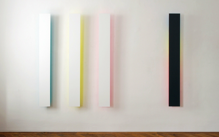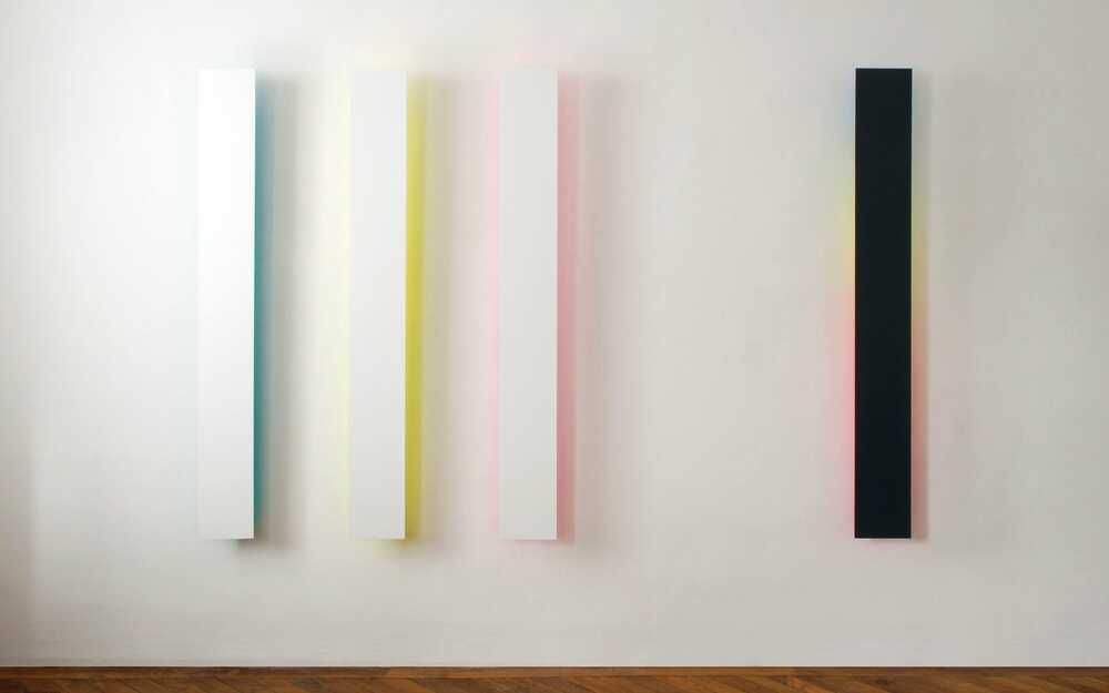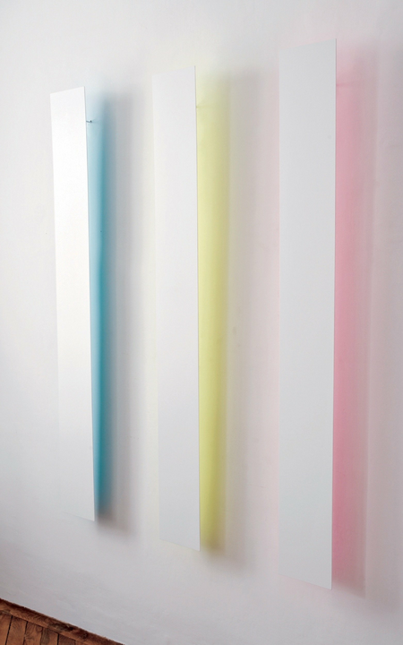 The wafer-thin strips hanging loosely on the wall and moving in the current of the air are pendent and emblematic of the fleetingness and immateriality of light.