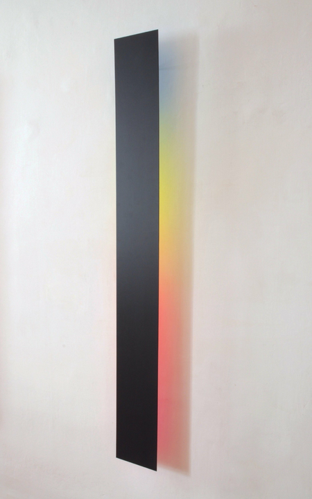 The strip has the primary colors painted on the back. Where they overlap, secondary colors emerge in the projection onto the wall. Together, they produce a color spectrum that is contained in daylight.