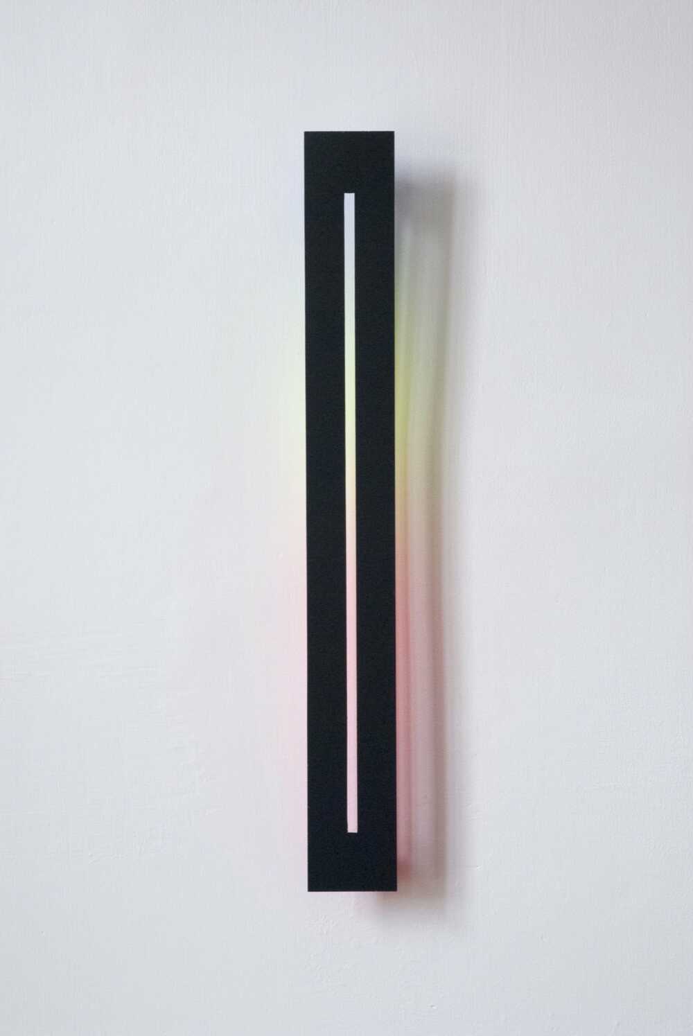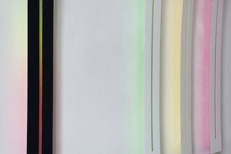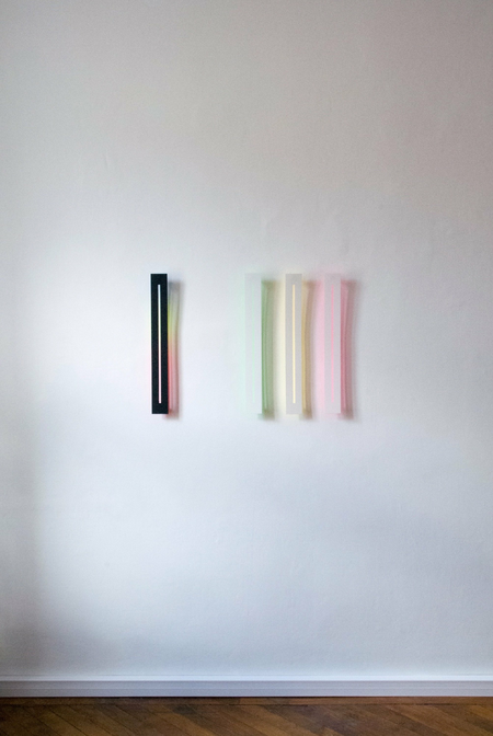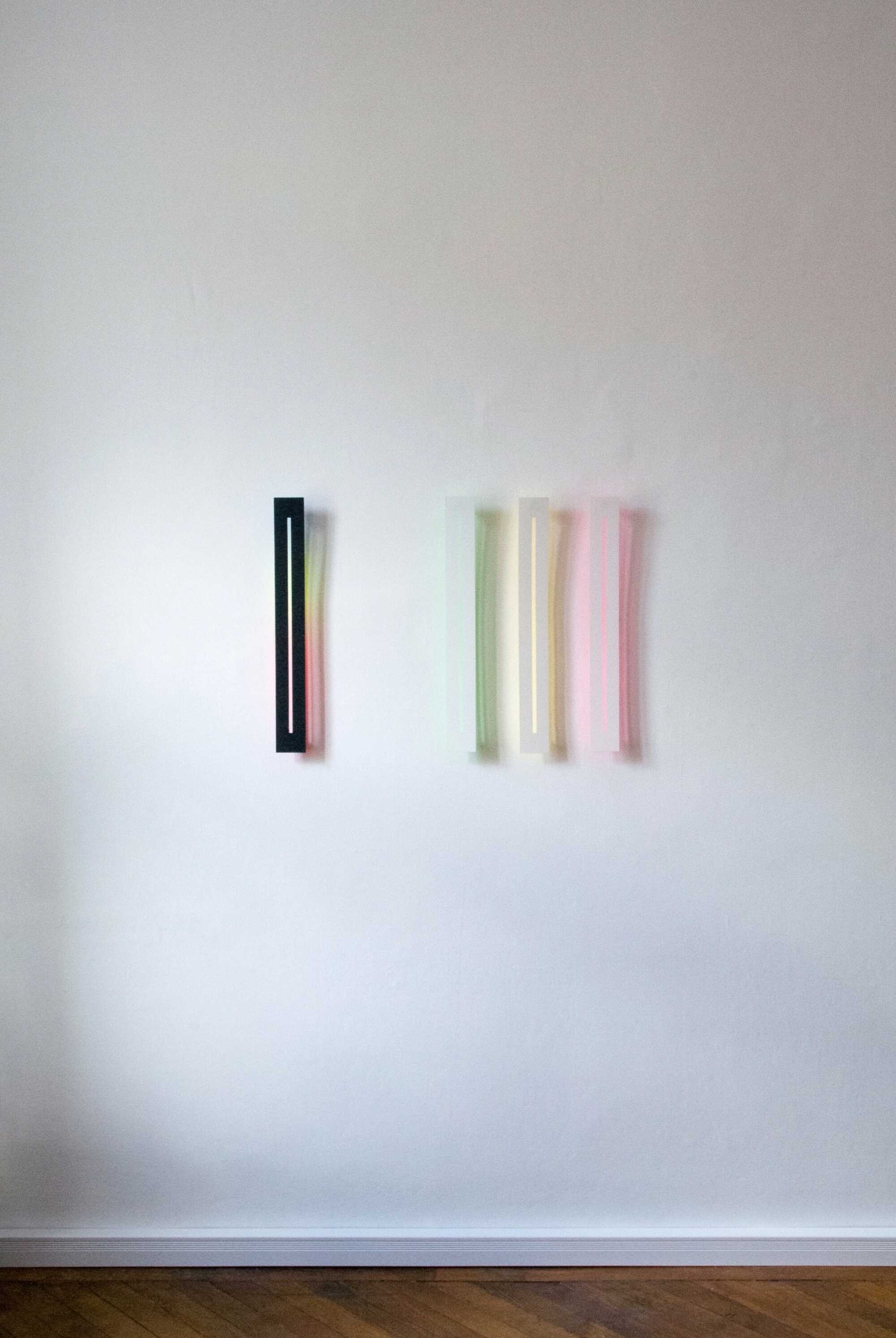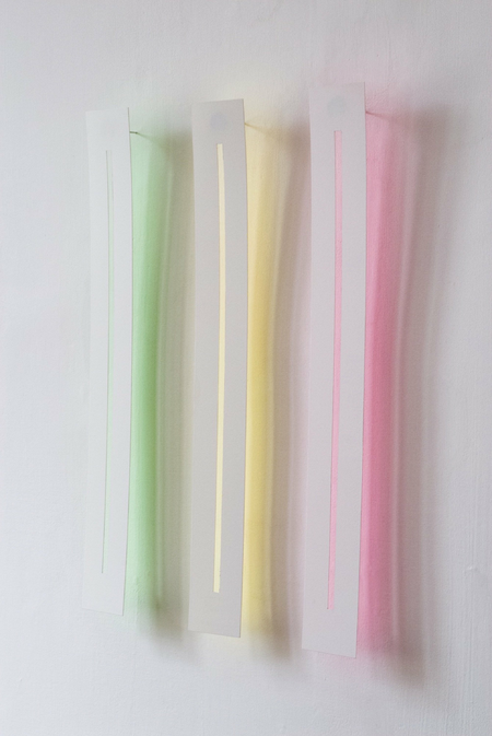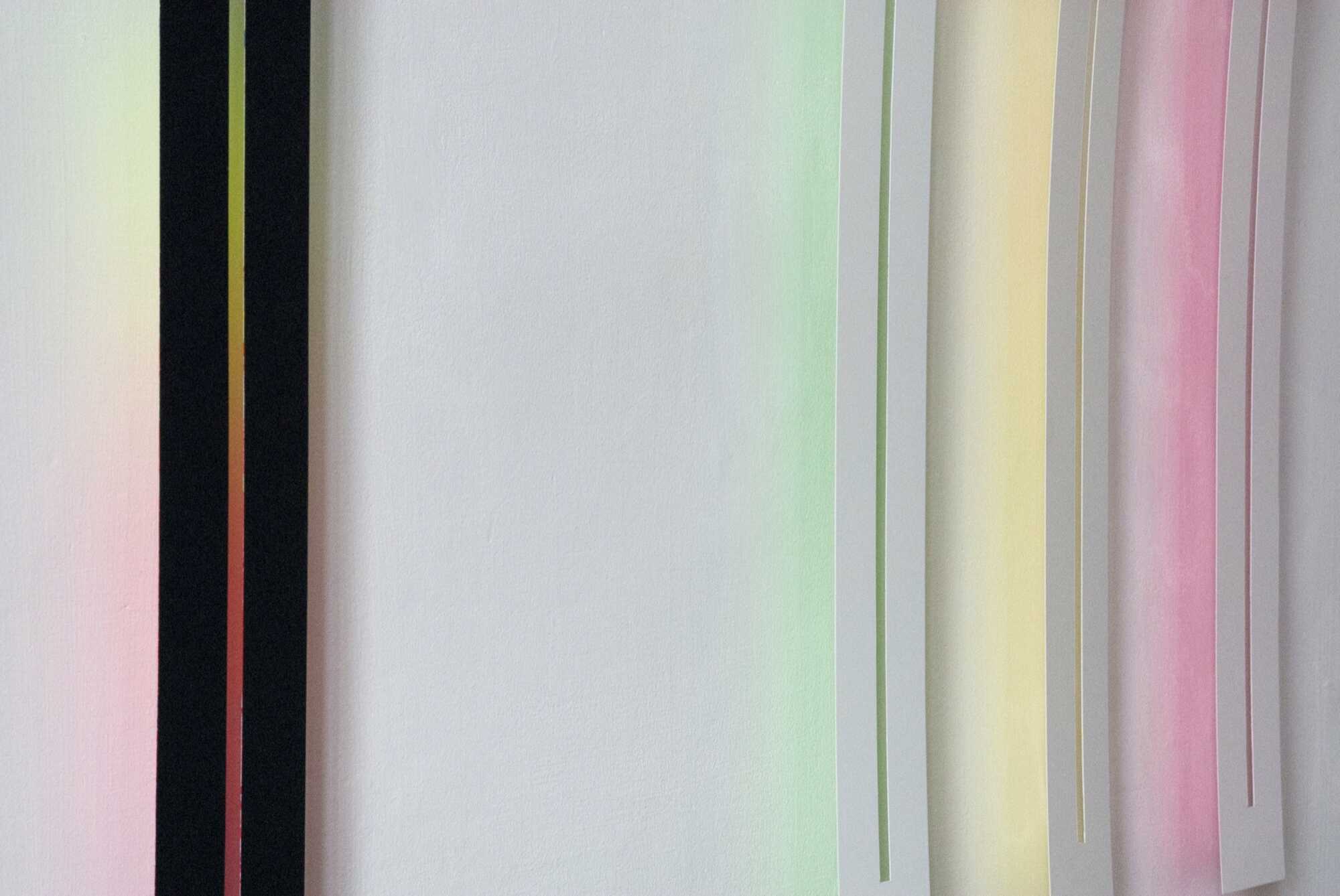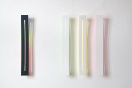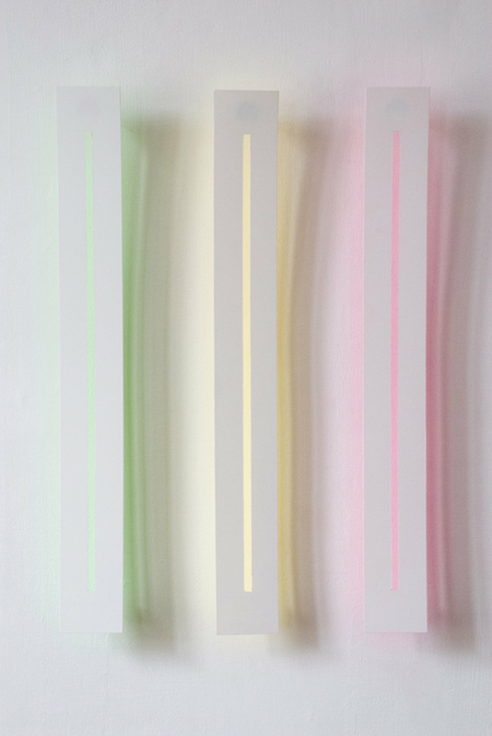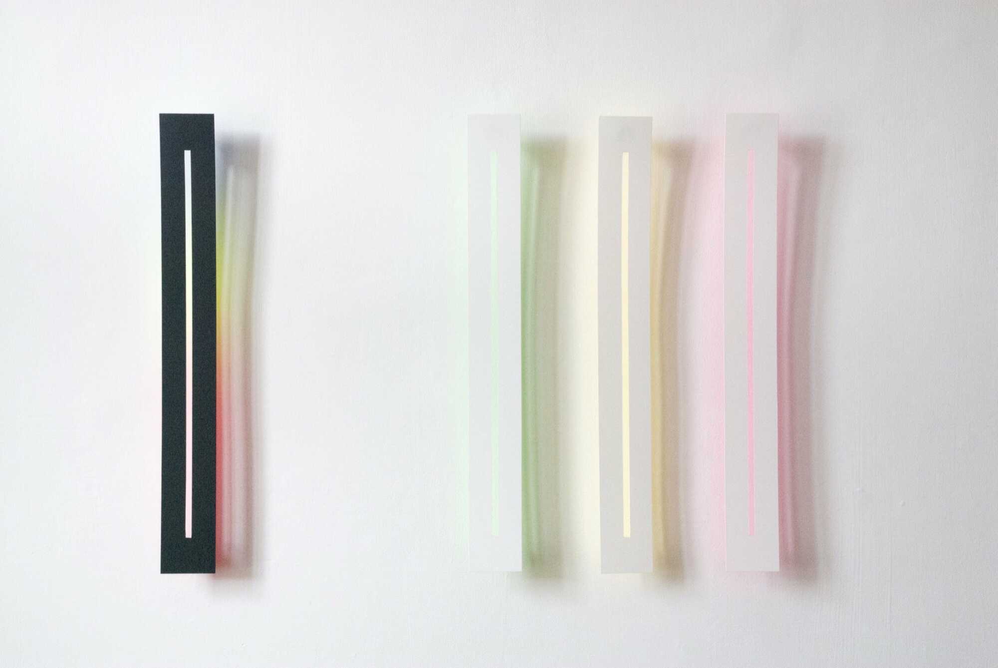 The wafer-thin strips hanging loosely on the wall and moving in the current of the air are pendent and emblematic of the fleetingness and immateriality of light.