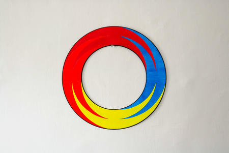 The circle has the primary colors painted on the back. Where they overlap, secondary colors emerge. With these, the entire color spectrum is displayed and the round shape creates a color wheel.