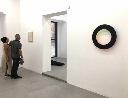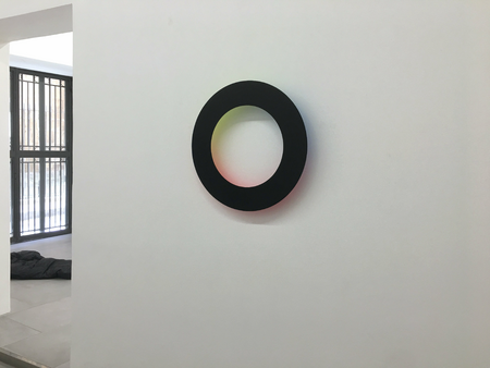 The immateriality of light and its colored reflexions is met by the very thin, almost intangible circle, the edges of which are beveled to make it vanishingly thin and hardly perceptible as a body.