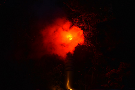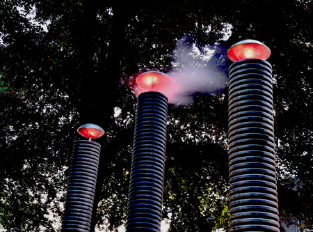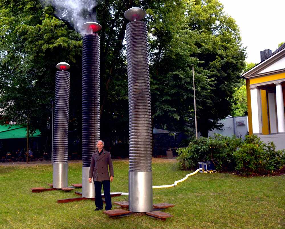 Die sich zuneigenden Drainagerohre sind mit rot angeleuchteten GFK Reflektoren gekrönt. Neben dem Klimawandel sind auch lokate Hochwasserkalamitäten thematisiert
