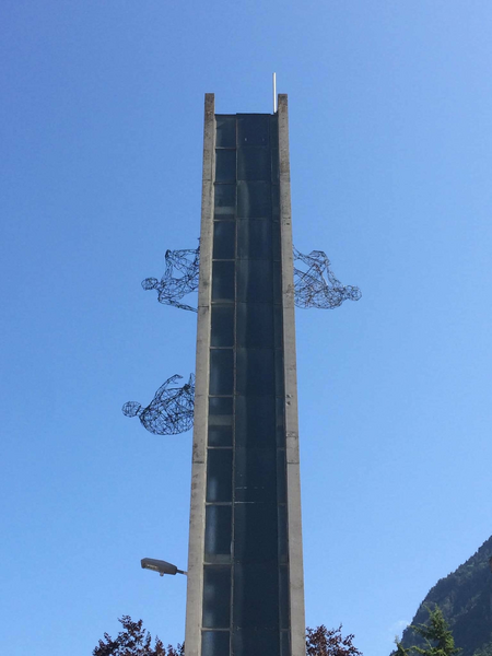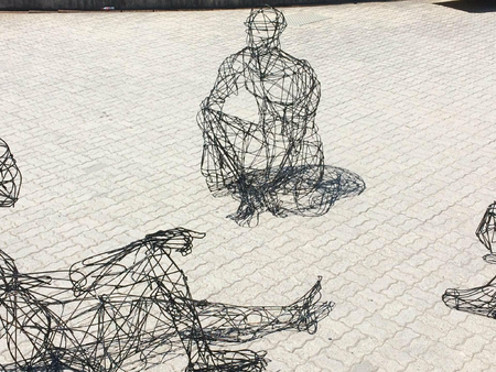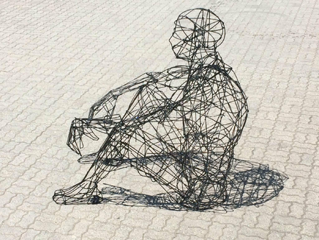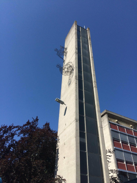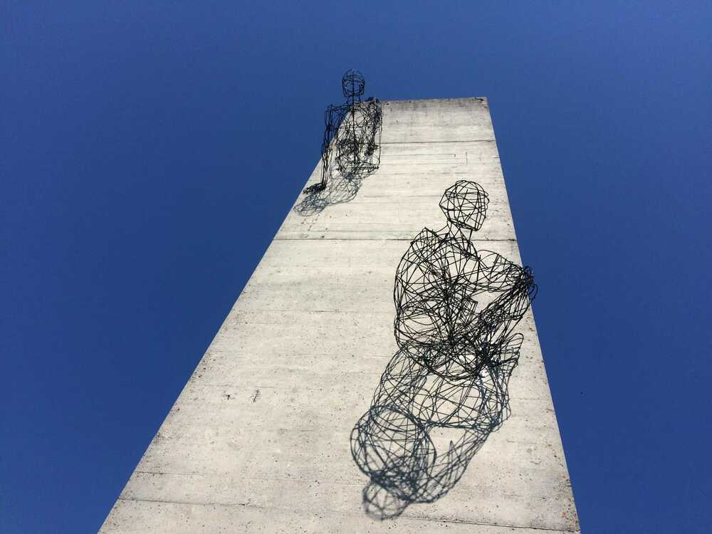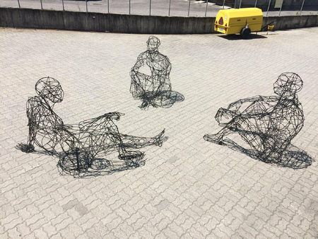 3 human figures are sitting on the wall of the tower. their eyes are fixed on the sky. we see a change of reality, a turn of the earth’s plane to a wall plane, a change of horizon, a symbol of a change of views, thoughts, actions. figures are welded from metal, painted with black paint. size of each 2x natural.