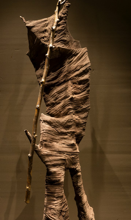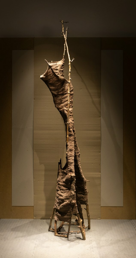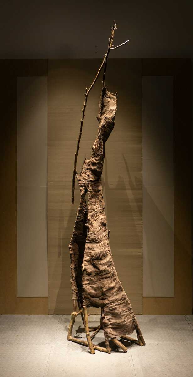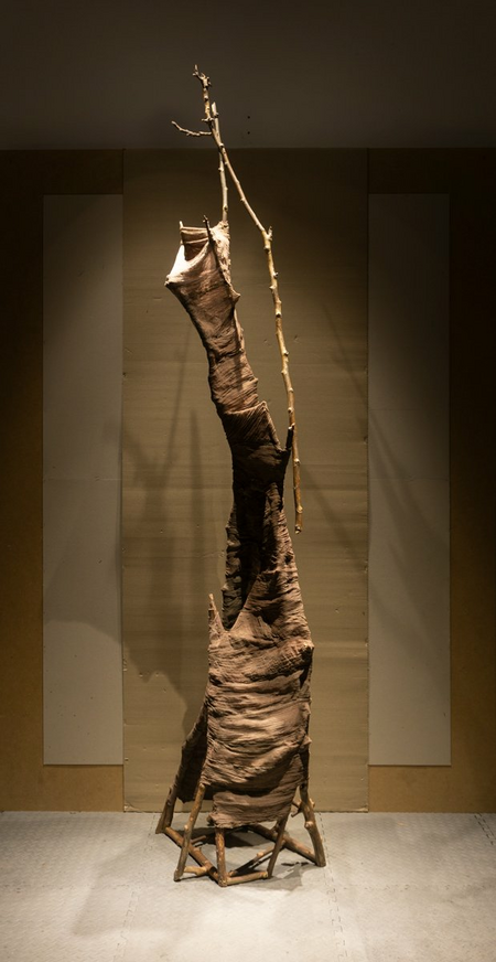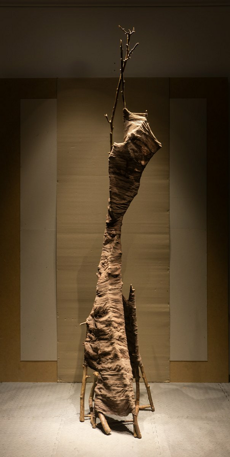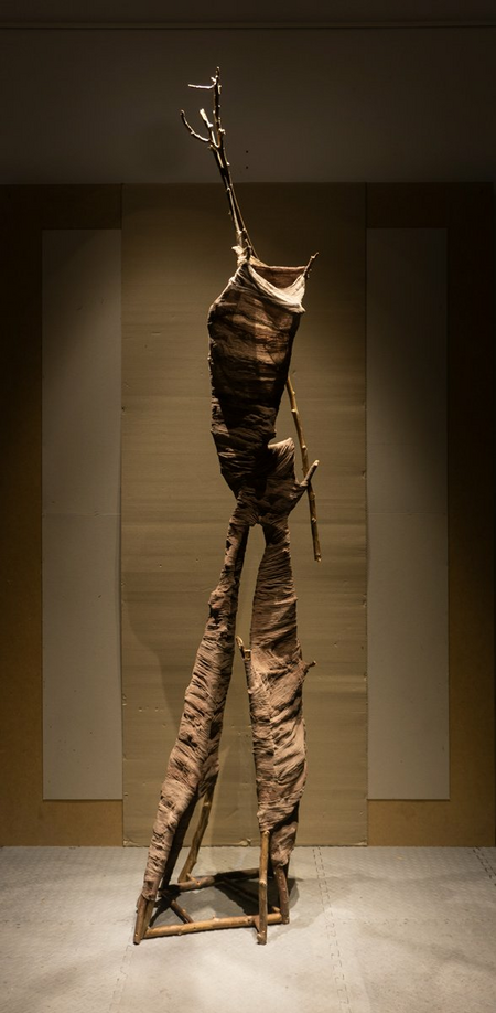 Free-standing work using tree branches, cotton gauze and color.