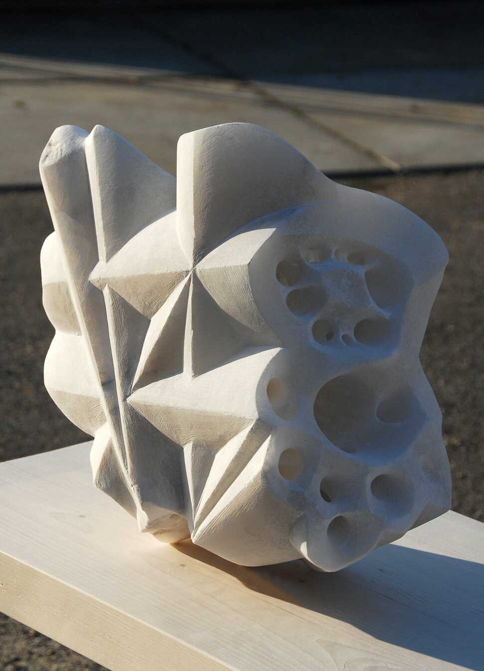 Experimental piece in Alabaster. Inside corridors created a kind of cathedral. The outer shape followd the lines from inside and turned out to resemble Moorish architectural elements.