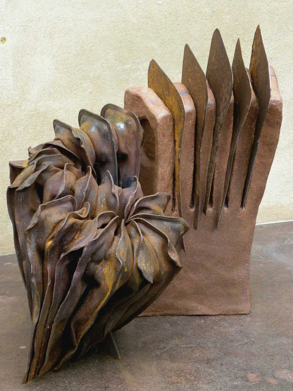 Bildhauerton, reduzierendf gebrannt, Oxyde,deformiertes Heizkörperfragment aus der Schrottpresse, Eisenblech, Schweiß- und Steckmontage