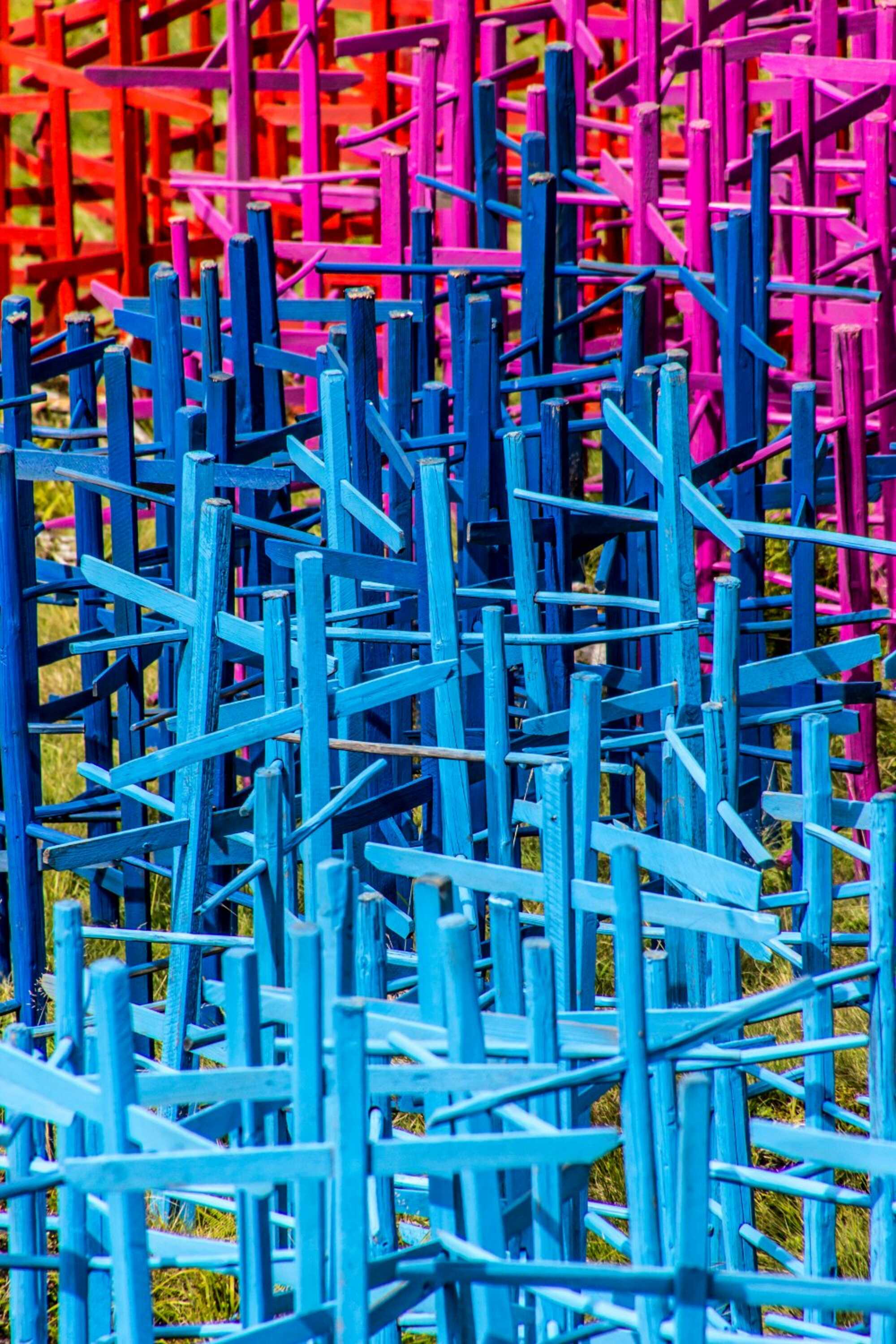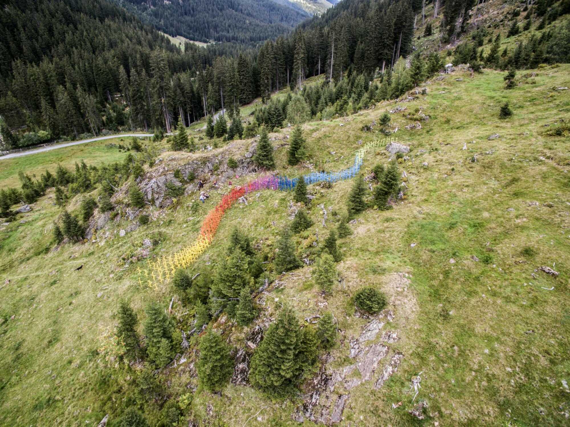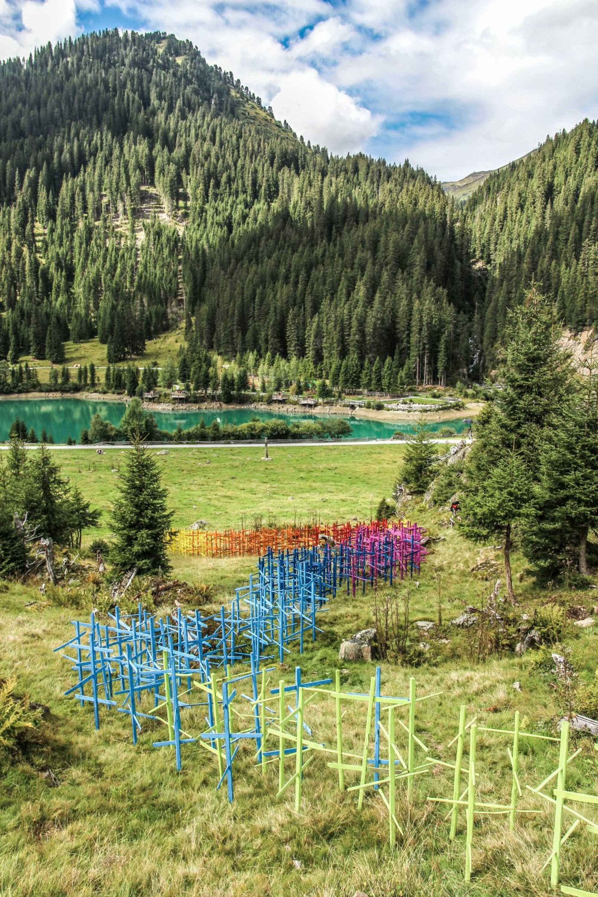 Diese Installation wurde im Rahmen vom 4. Kulinarik & Kunst Festival 2018 in St. Anton am Arlberg realisiert und zeigt einen regenbogenfarbigen Flussverlauf aus lackierten Heumännchen, der in den Verwallstausee mündet.