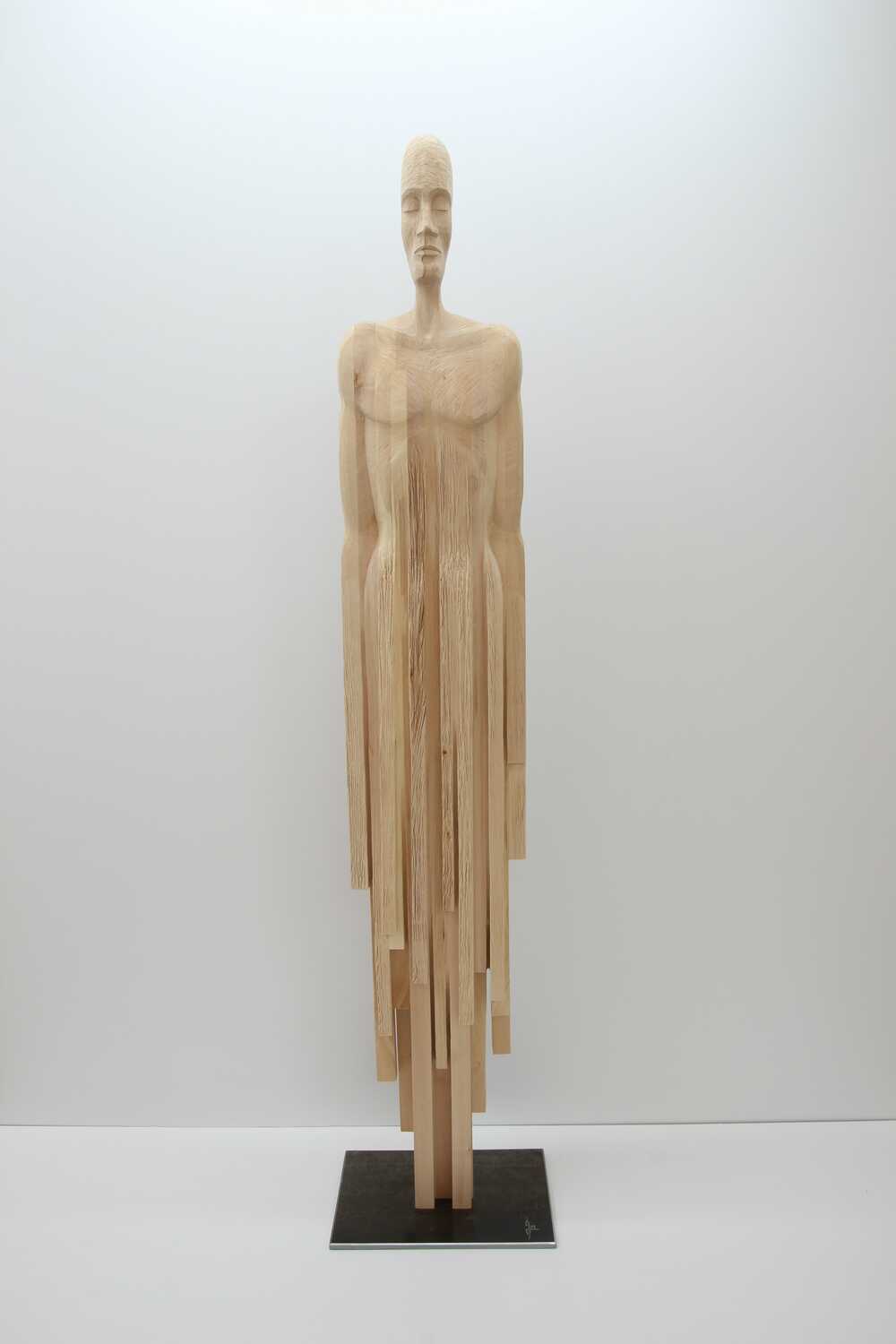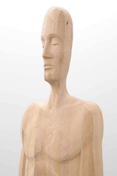Die Skulptur „human flow AEGAEON“ wurde durch ein aufwendiges Verfahren aus vielen einzelnen Lindenholzleisten verleimt.