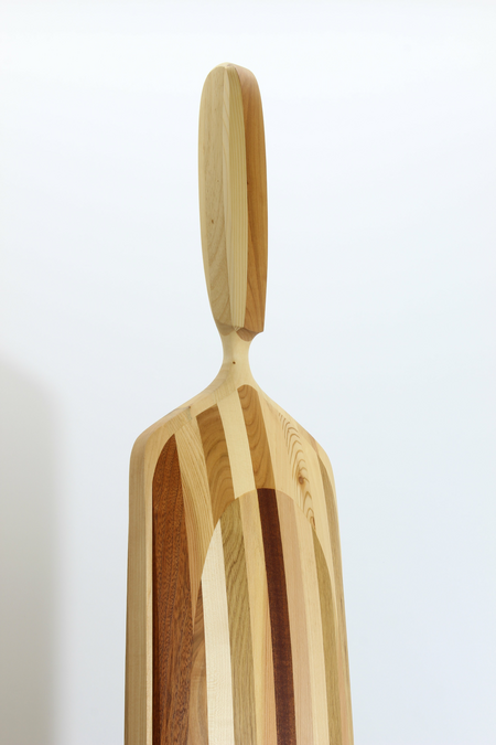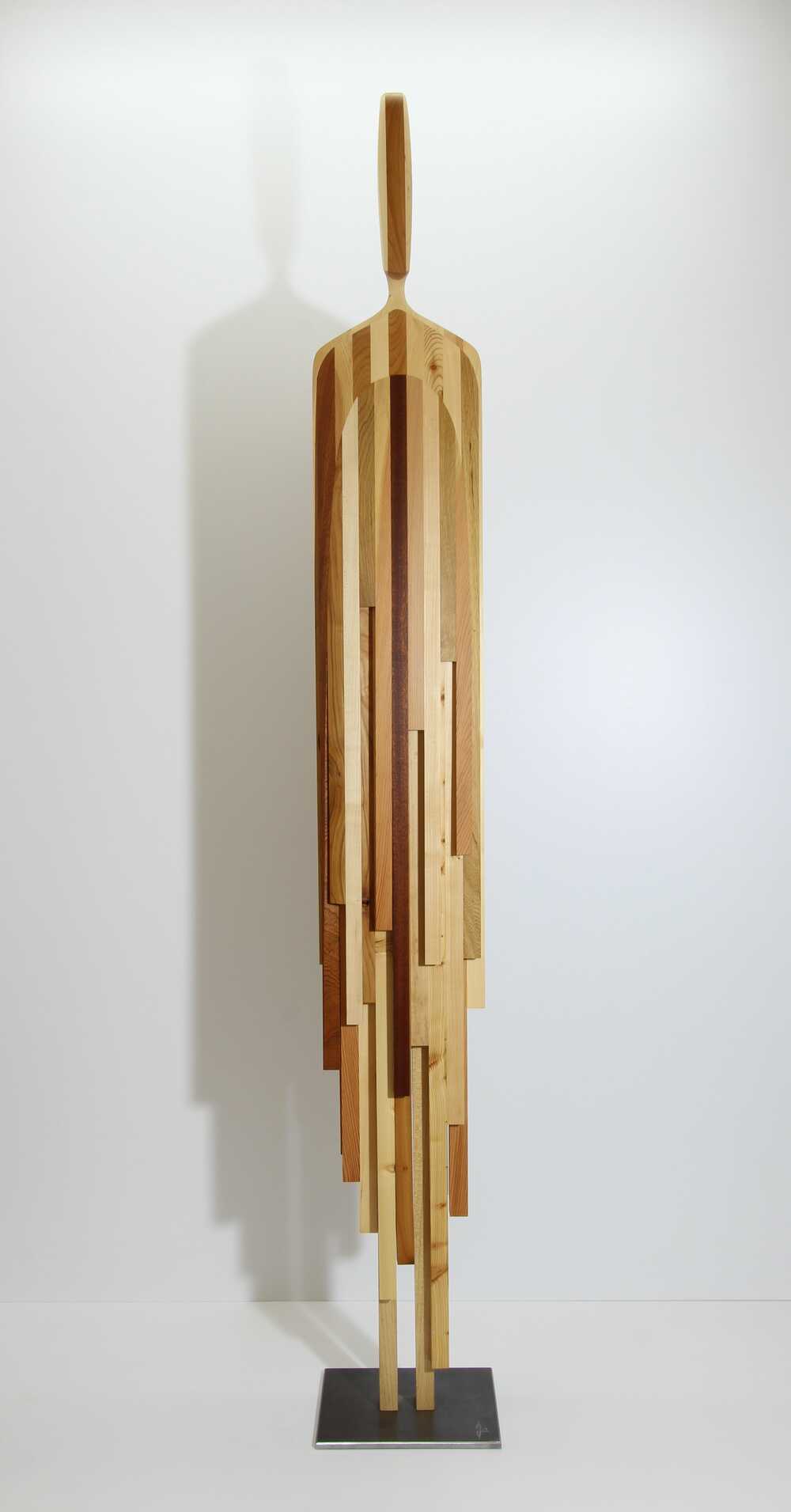 Die Skulptur „human flow CALYPSO“ entstand durch ein aufwendiges Verfahren aus vielen einzelnen Holzleisten und insgesamt 10 unterschiedlicher Holzarten.