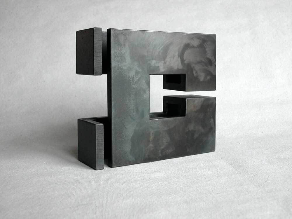 Kleinplastik aus Stahl, geschweisst und mit schwarz gebrannter Oberfläche, aus der Serie "Wendungen". Die Plastik hat keine "Schauseite" da es mir wichtig ist, dass sie in allen Positionen einen ausgewogenen, skulpturalen und fast monumentalen Eindruck macht.