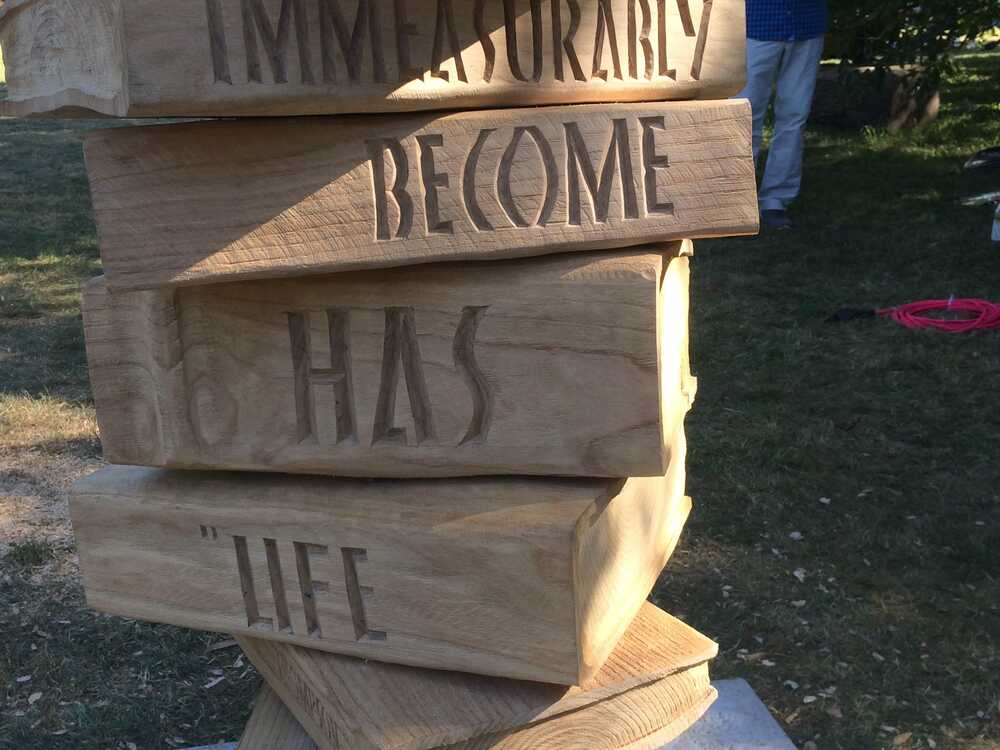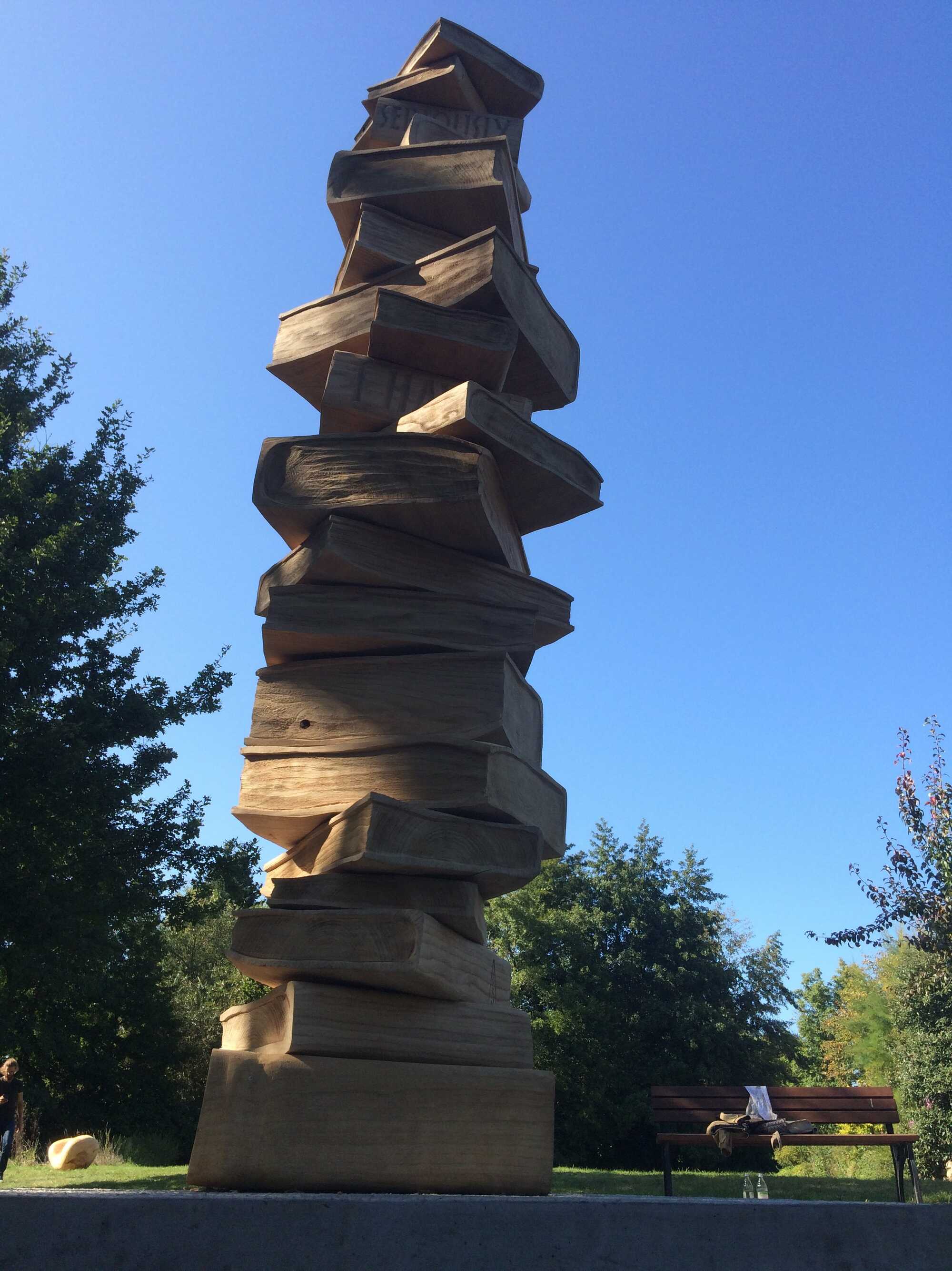 Um den Bücherstapel läuft ein Zitat des Schriftstellers Hunter S. Thompsen:´´life has become immeasurably better since i have been forced to stop taking it seriously´´