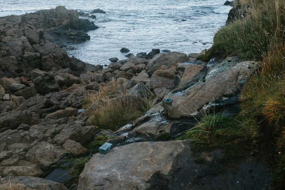 Zwei Bronzeelemente direkt an einer kleinen Quelle in den Klippen von Skargaströnt, Nordwestisland, eingearbeitet.