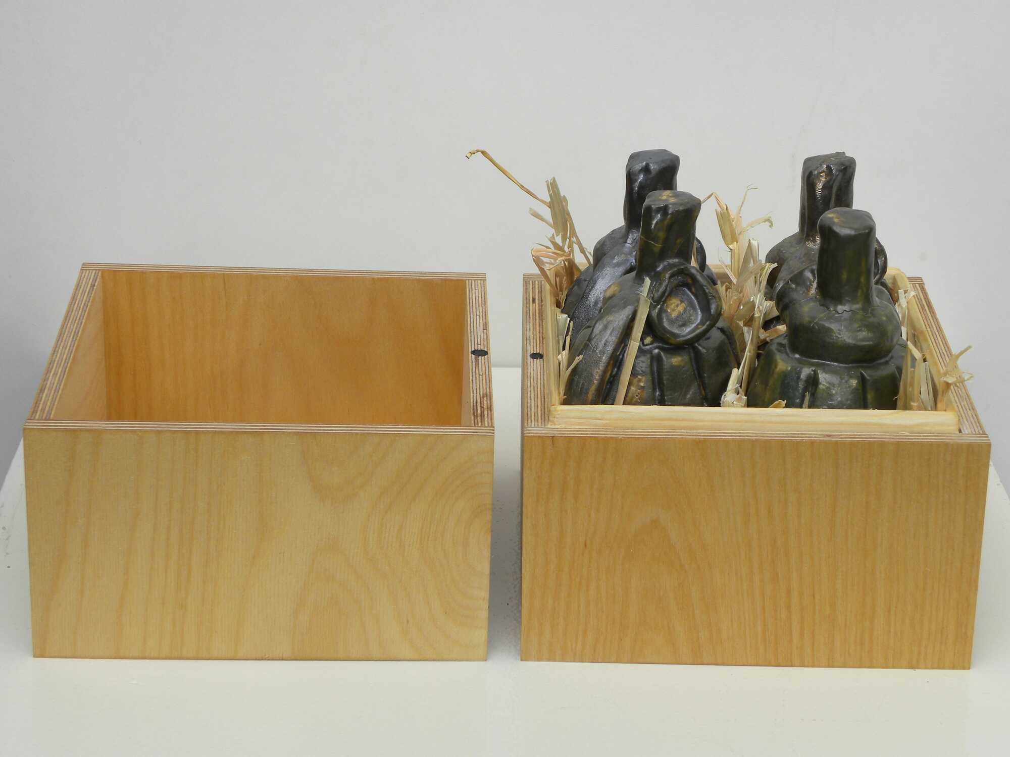 "Handgranaten", serielle Unikate, Gießkeramik in primär hergestellte Gipsform auf Tonmodell, Redoxglasur, Holzkasten, Stroh