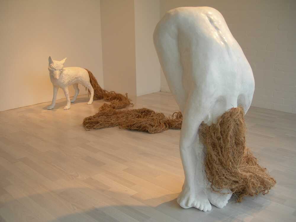 The naked, vulnerable woman in INESCAPABLE wrestles with the fox, representing her talents. She is inextracably connected to the fox but cn reach it only with great effort: a fox rarely shows itself.