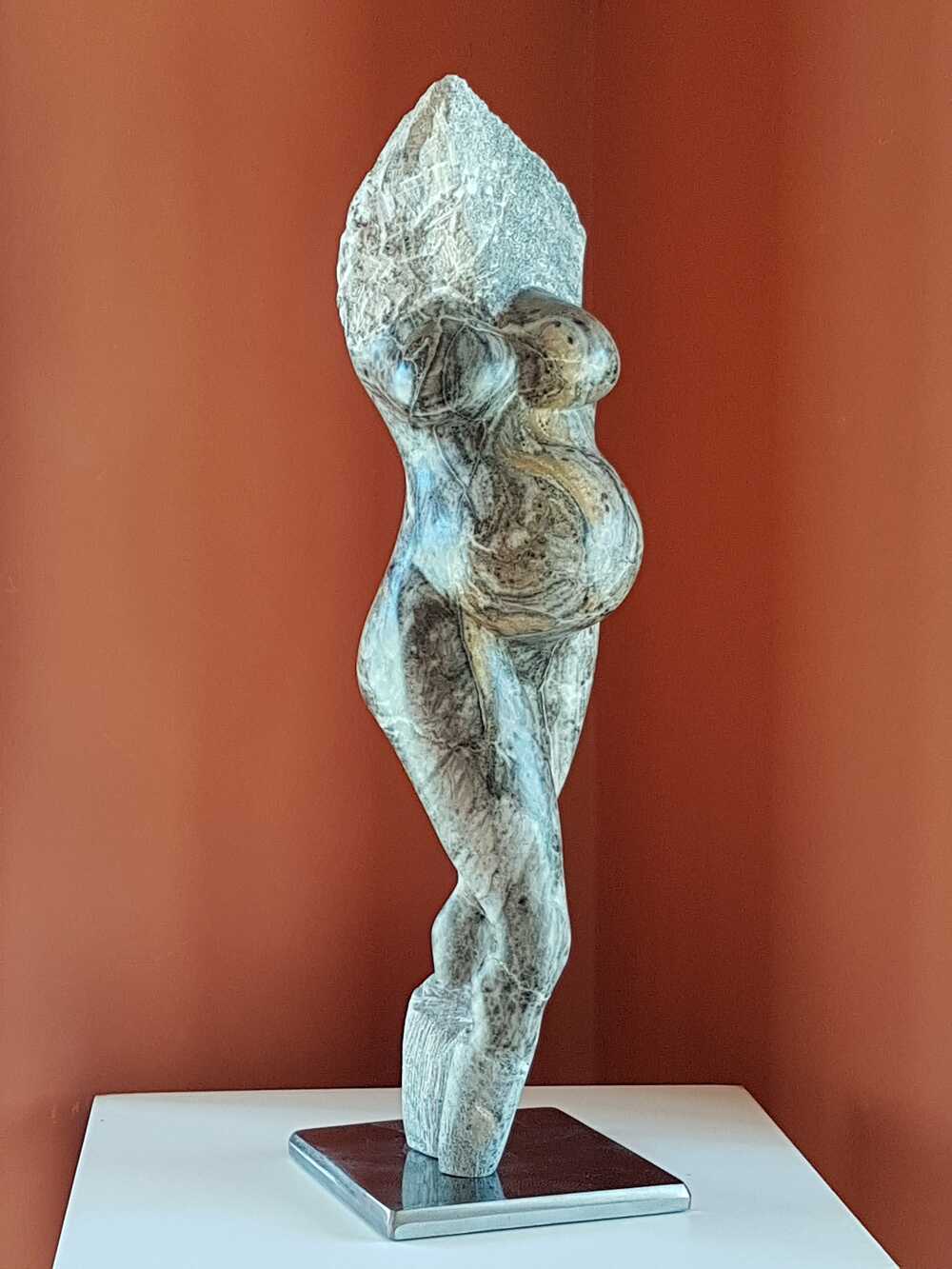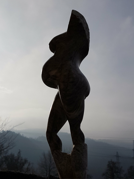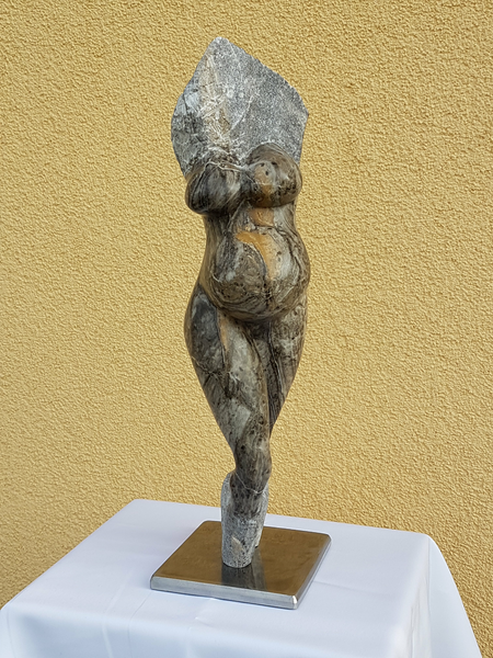 Schwarzer Alabaster mit weißen und gelb-orangen Einlagerungen