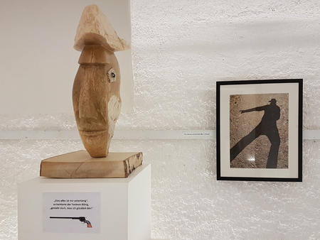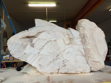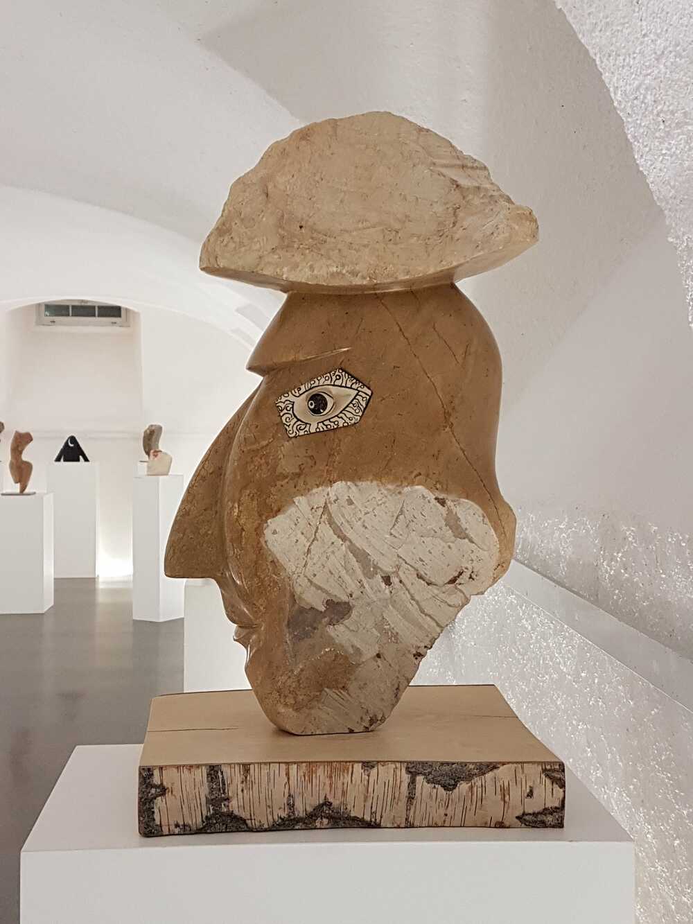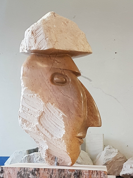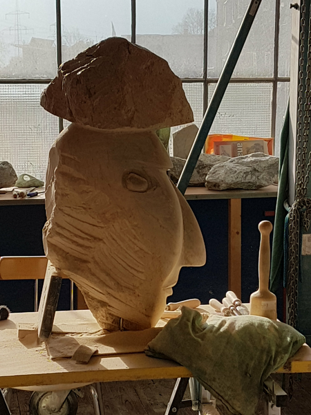 Von der ersten Bearbeitung in der Werkstatt zum Endprodukt in der Ausstellung: groĂźer brasilianischer Steatit (warmbraun) auf Holzsockel (Birke)