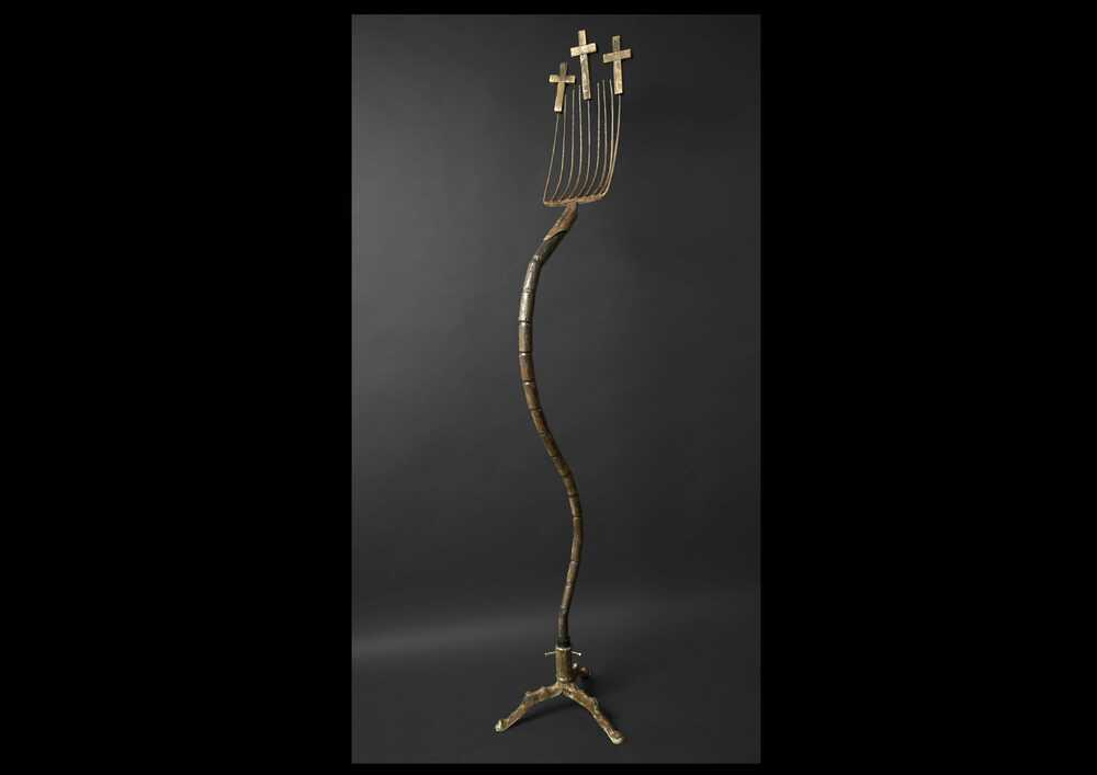 Eine Mistgabe kreativ defomiert.
