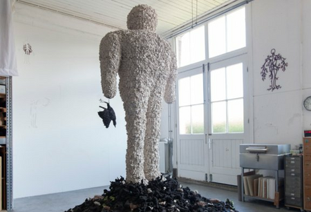 A ceramic sculpture about the cycle of life. Everything we waste comes back in the system. The figure is a creature that originated as a result of human action, a golem, a boneman and takes death with it in the form of dead animals such as birds, rats, mice, bees, butterflies and dragonflies.