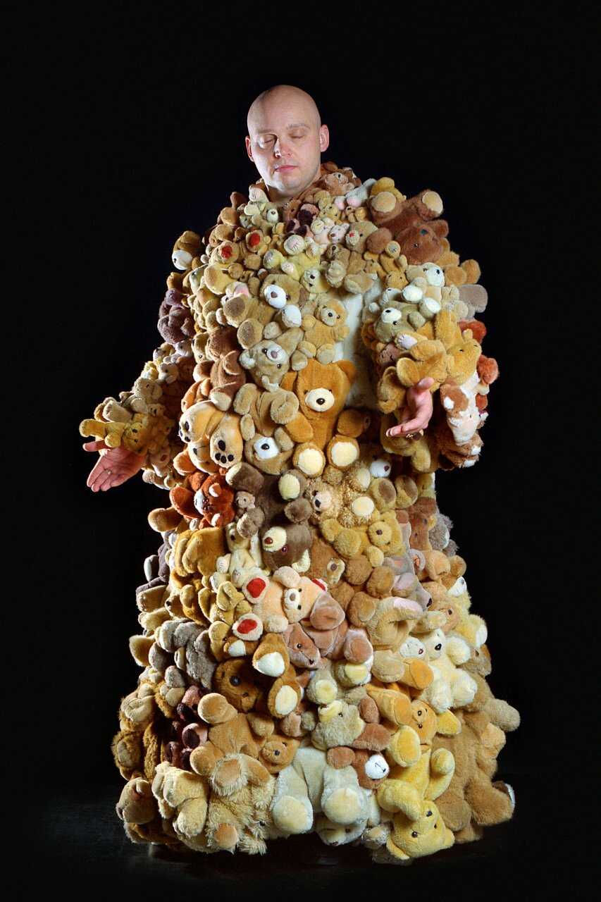The bears are shaped into a jacket, they form a second skin. It offers protection, but it also hides. She hides her lover in the coat and makes him something else: he becomes a huge animal that you can hug.