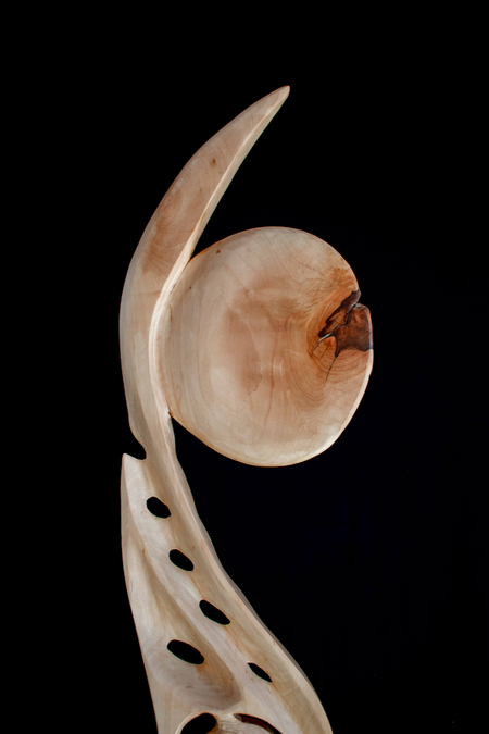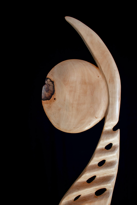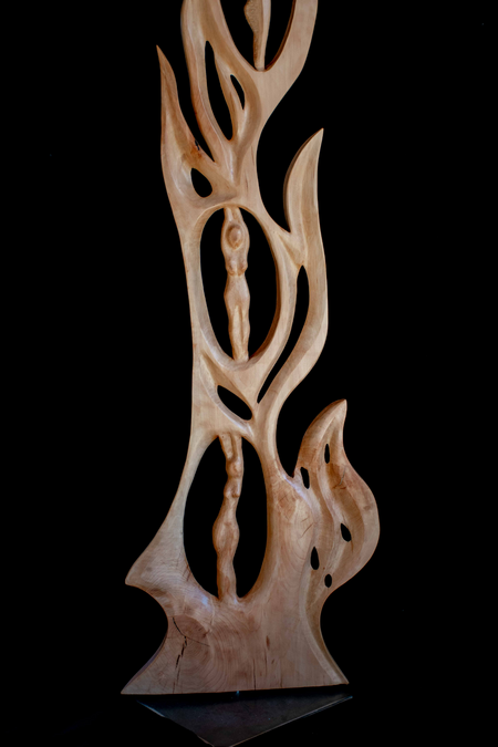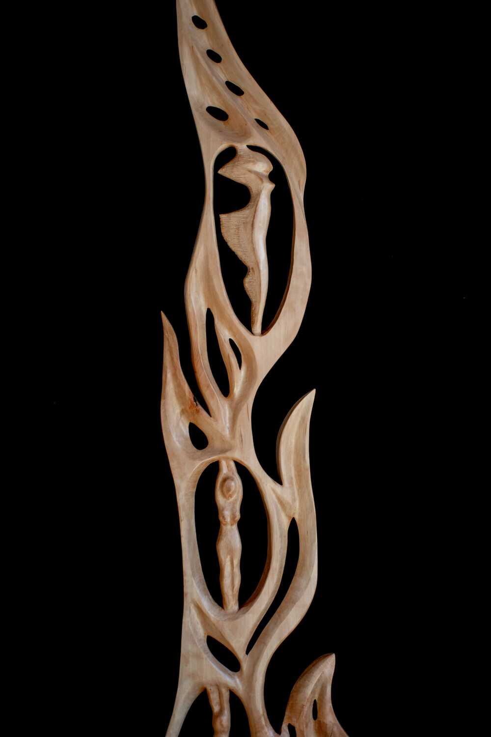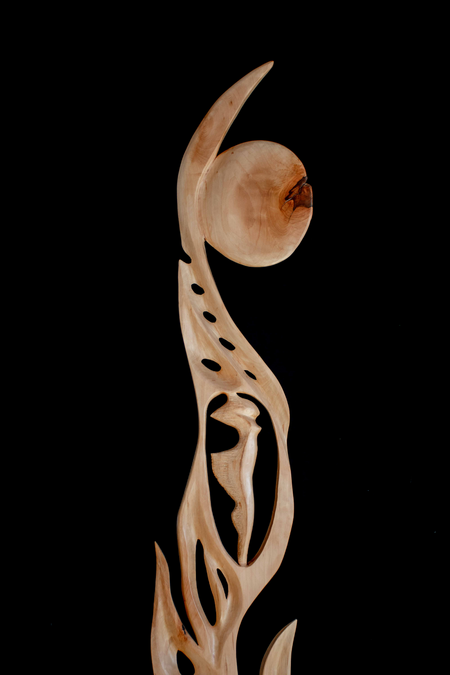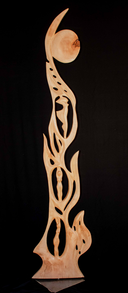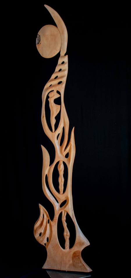 Aus einem alten, gut gelagerten Birnenholz-Brett wollte ich ein sehr filigranes Werk schaffen. Mit vielen Durchbrüchen und teils sehr dünnen Stellen entstand "Sibyllen".