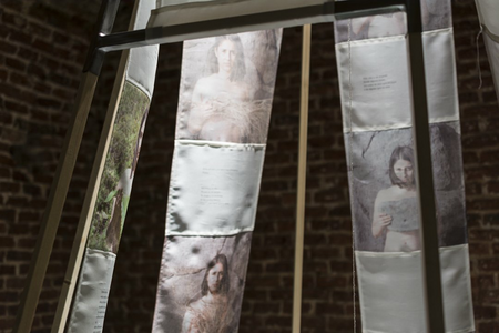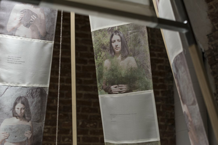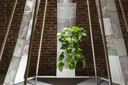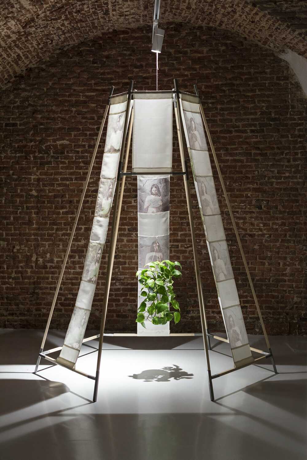 The work is a dialogue between image and poetry that reveals the conflict between human beings and nature. This assembly of portraits and poetic fragments questions the integration of the being with its surroundings, with the earth, with the stone, with the wind, with the animals, with the plants. The structure builds a temple, a place of refuge and protection for man and his fears. The work is a wink to the first architectures, spaces protecting man from the inclemency of the environment but maintaining the connection with the natural world. The central light bathes the silk strips revealing compositions of photography and poetry that build visual stories that play between the threshold of the real and the dreamlike. The plant rotates slowly under the light. The portraits contemplate the garden from which, one day, we come.