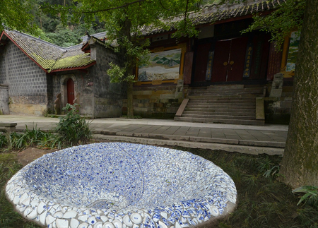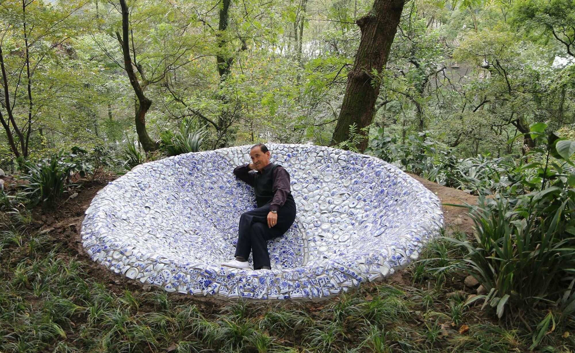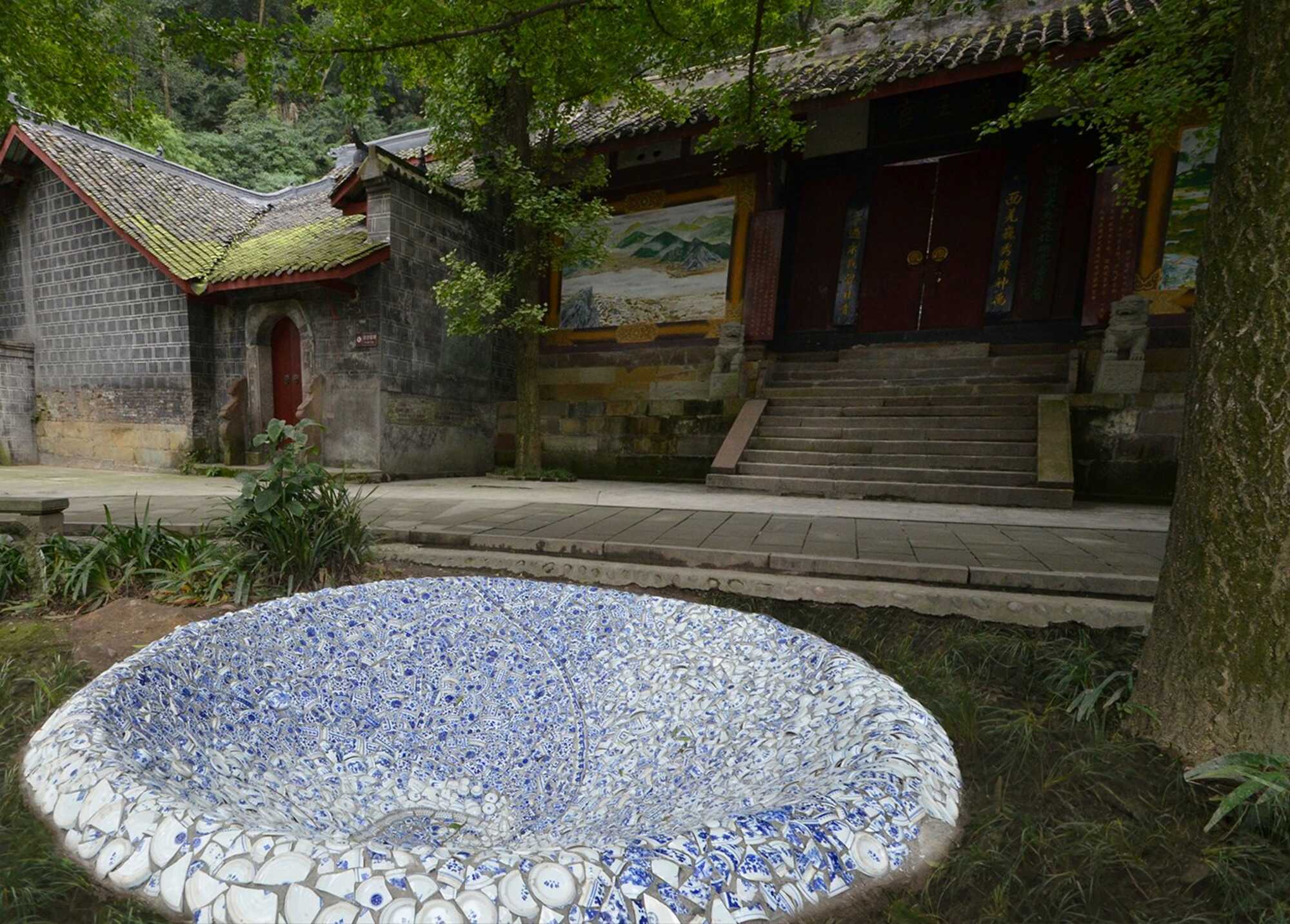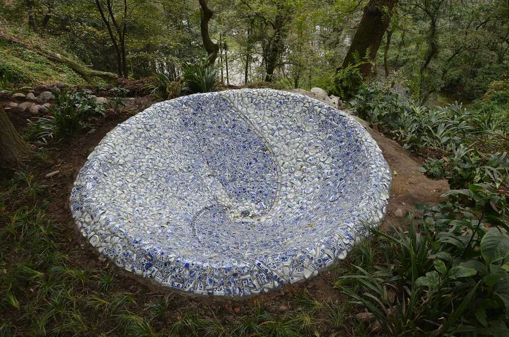 Fragments of china porcelain form this funnel into Yu Lei mountain, an artpiece along the historic tea trade trail. At first sight it can be read as a tribute to the ancient culture, that is still feeding our culture today. Patterns of blue and white porcelain in the sculpture tell us about yin and yang balance, values that are still able to inspire us beyond the challenges of modern life. At closer look you will find also pieces of porcelain coming from European countries. As happens in this sculpture, our cultures get closer and eventually we are influenced and inspired by one another. At the bottom of the funnel there is the drain, to let the rainwater out of the sculpture. The drain pipe also tells us to cherish our fundaments, and not let them be washed away.