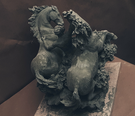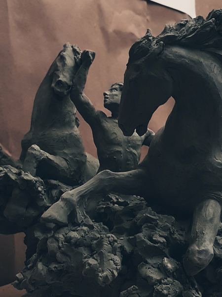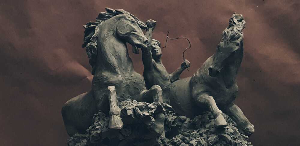 Animalistic artwork representing a young man with two stallions, an a stream.