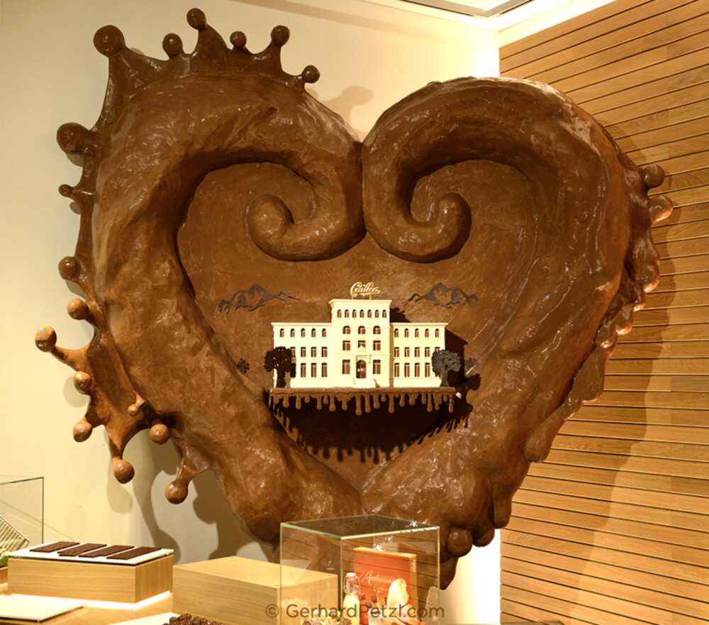 Installation for a chocolate museum in Switzerland. Design is a splashed heart with an architectural model of the factory in the Center. More than 200 kg chocolate used.