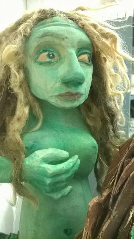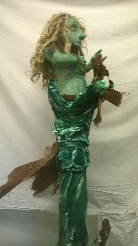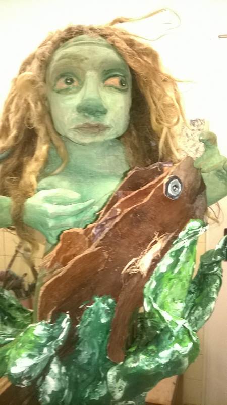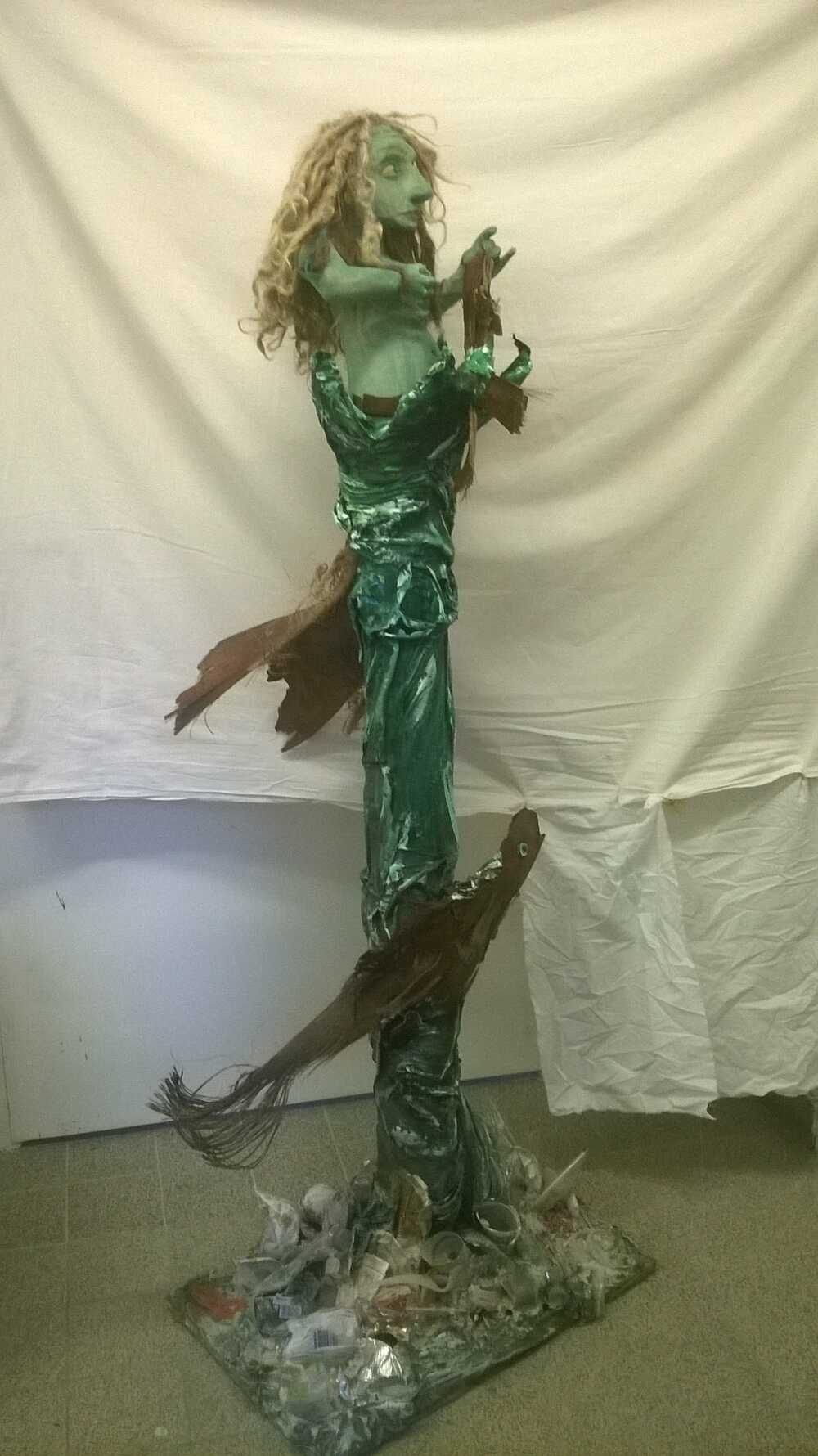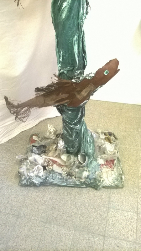 Eine Seejungfrau erhebt sich aus den Fluten und berührt zärtlich einen kleinen Fisch. Sie schaut skeptisch und etwas zornig um die Ecke, denn sie wundert sich über die Menschheit, die all ihren Müll gedankenlos überall liegen läßt, so dass der Grund des Wassers schon so verschmutzt ist, dass auch der grßere Fisch, der rettungssuchend zu ihr empor blickt, nur noch mit den letzten Atemzügen zu schwimmen vermag und bald kein einziges lebendes Wesen mehr in diesem Gewässer verbleiben wird.