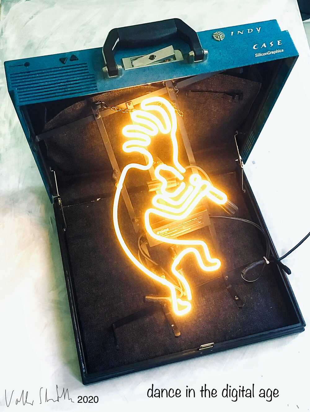 A mockup suitcase of an old Iris Indy workstation (Computer) with a neon Sculpture of a faun with a flute; 220 V.
