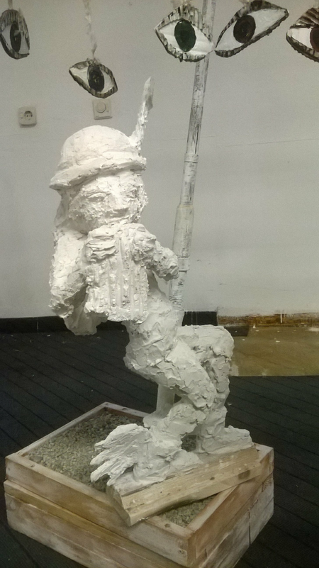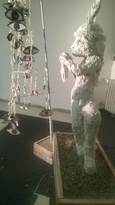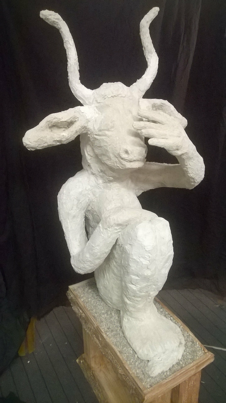 Eine dreiteilige Plastik mit einem Thema aus der alten griechischen Mythologie, welches auch für die heutige Zeit sehr zutreffend ist. Nachdem Io, vom ehebrechenden Zeus verführt oder vergewaltigt wurde, verwndelt der Göttervater diese, aus Angs vor seiner Gemahlin,in eine Kuh. Die gekränkte, eifersüchtige Ehefrau will nun jene schöne, weiße Kuh zum geschenk. Zeus erfüllt ihr den Wunsch, aber Hera hat nichts anderes zu tun, als sie an einen geheimen Ort zu verbannen und von ihrem hundertäugigen Wächter, dem Ungeheuer Argos überwachen zu lassen. Zeus bekommt ein schlechtes Gewissen und will Io helfen. Er begibt sich zum Götterboten Hermes,n verzaubert sich selbst in einen Specht und weißt ihm den Weg zur Nymphe Io. Hermes soll auf seiner Flöte spielen und zwar solange bis der gefährliche Wächter eingeschlafen ist. Im Anschluß soll Hermes das Ungeheuer töten. Was dieser auch befolgt und erledigt.