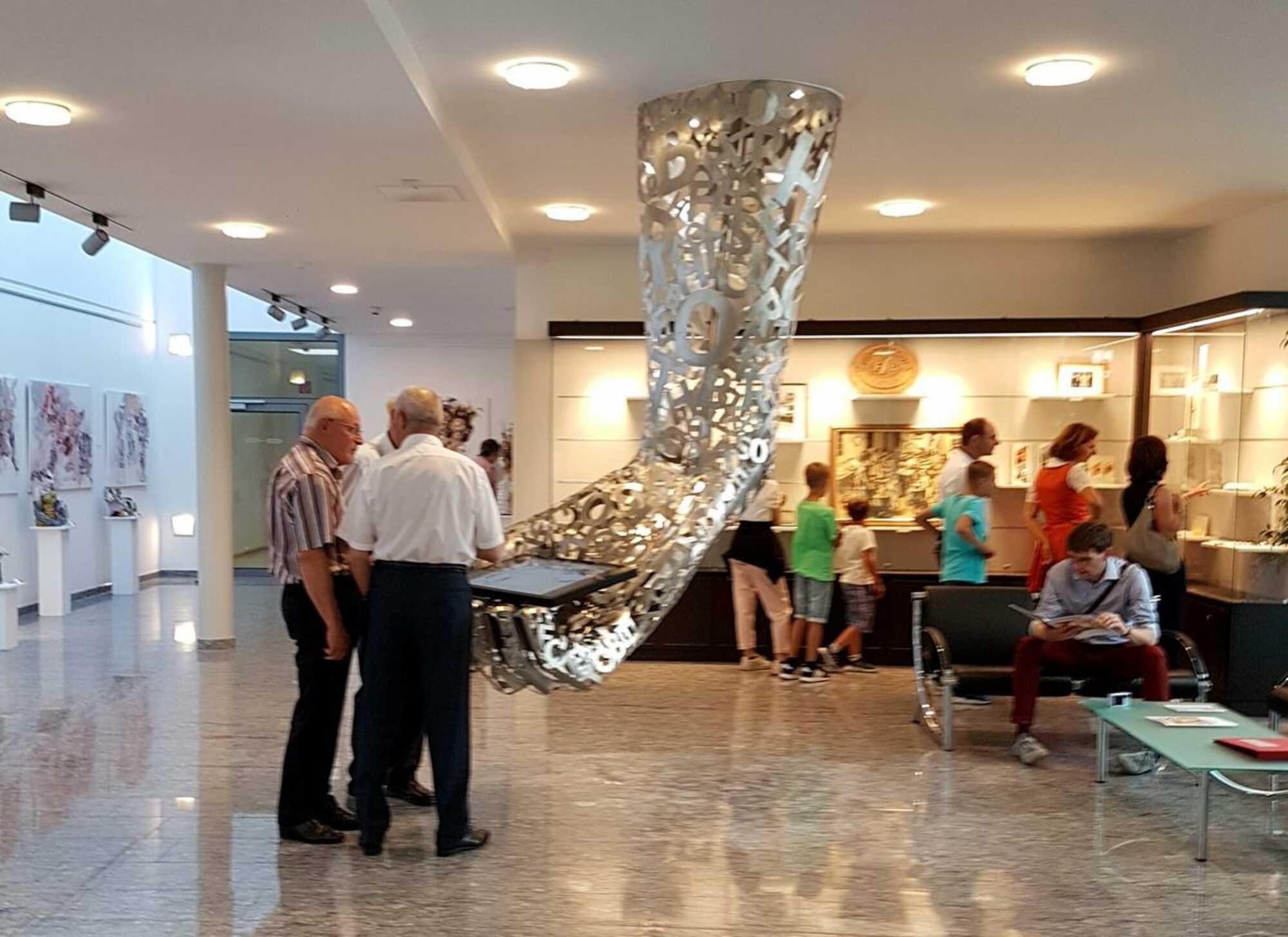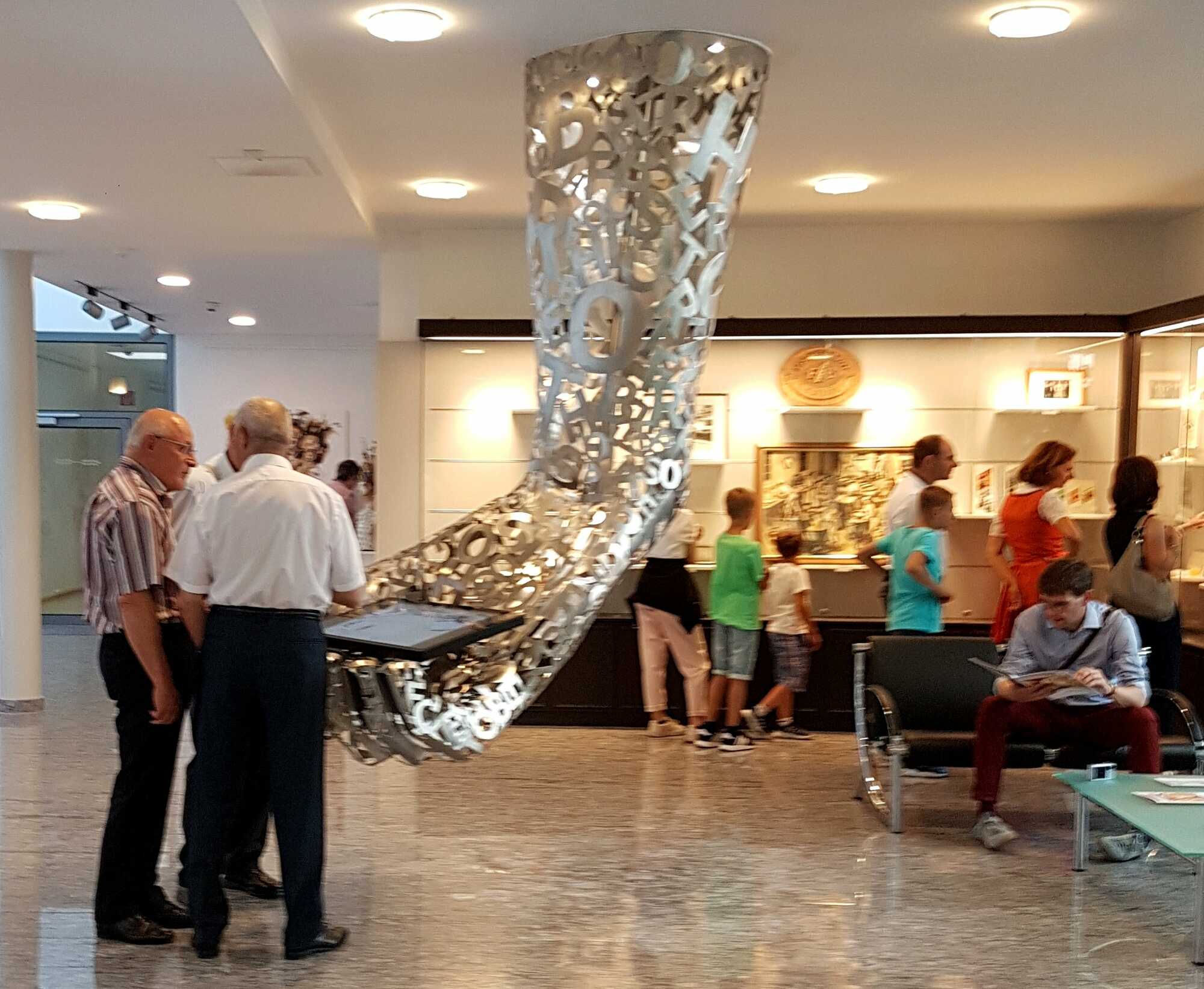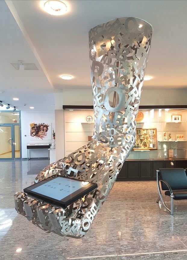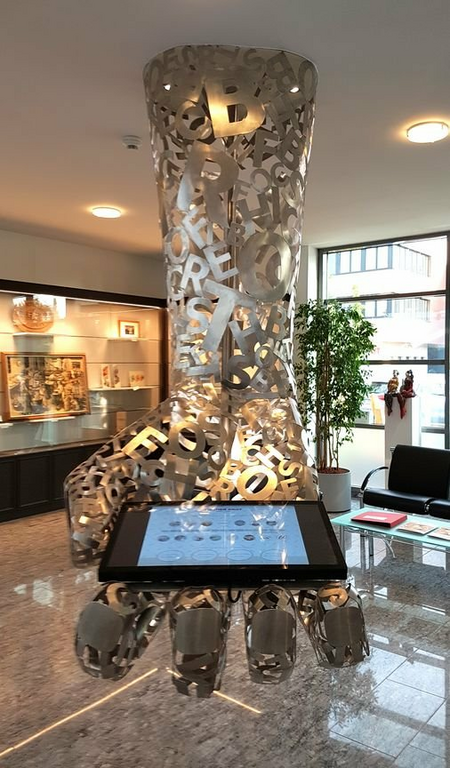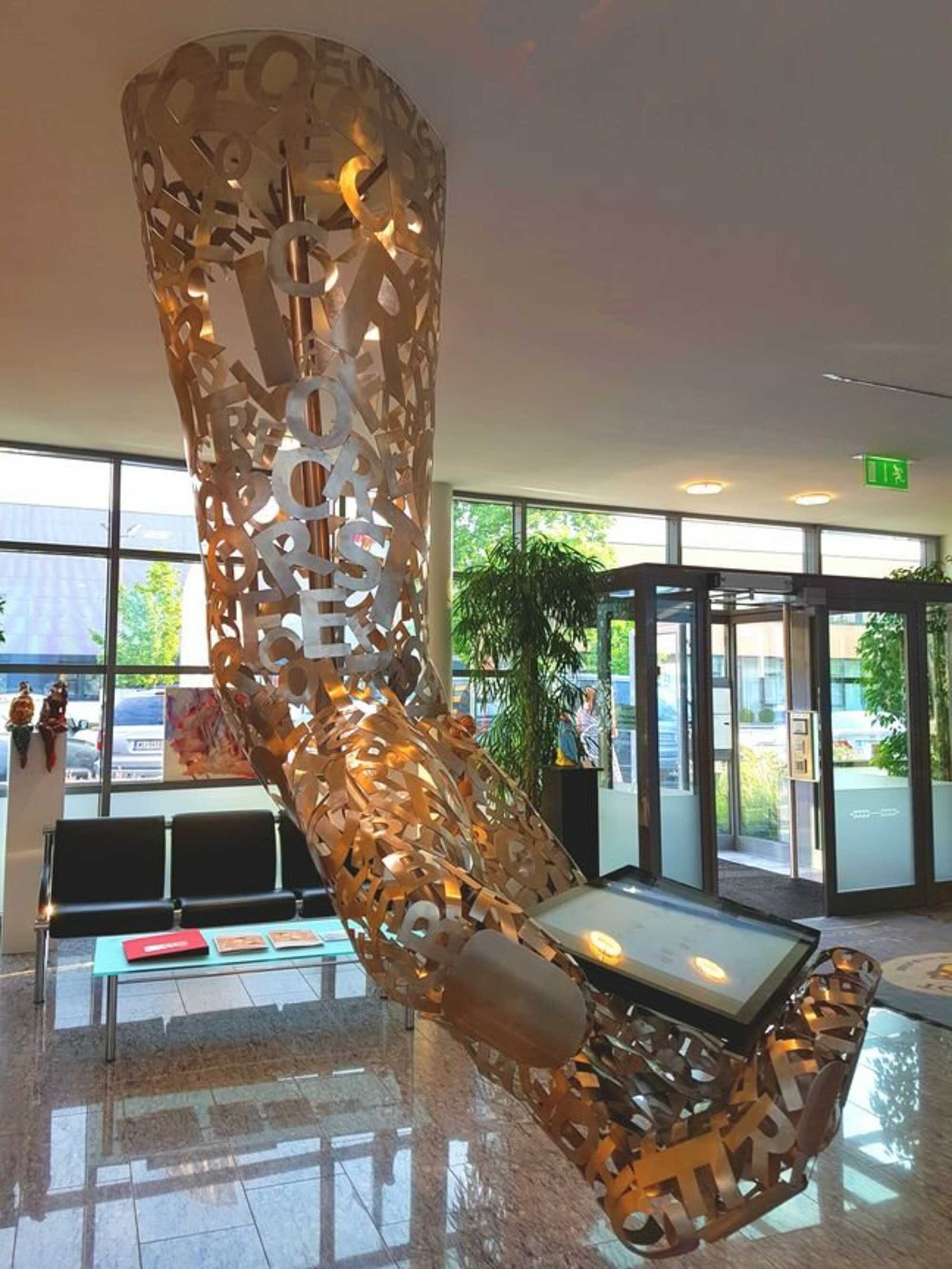 420 Cr-Ni Buchstaben aus dem Firmennamen FISCHER BROT formen eine Hand die aus der Decke kommt und 1 Meter über dem Boden schwebt. Durch die Auflösung der Oberfläche in Buchstaben wird die Skulptur leicht und fügt sich elegant in die Eingangshalle ein.