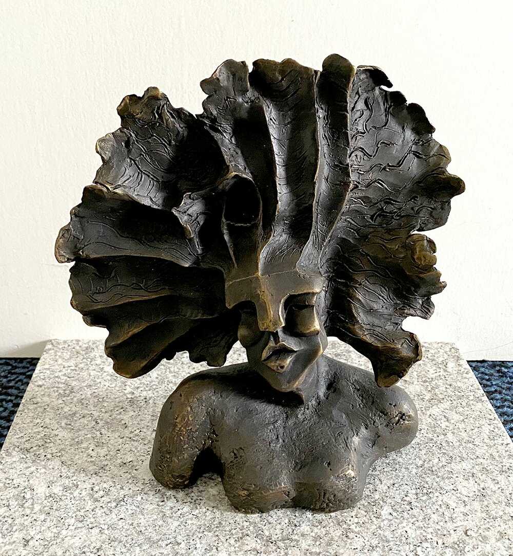 Abstract bronze sculpture of a female bust.