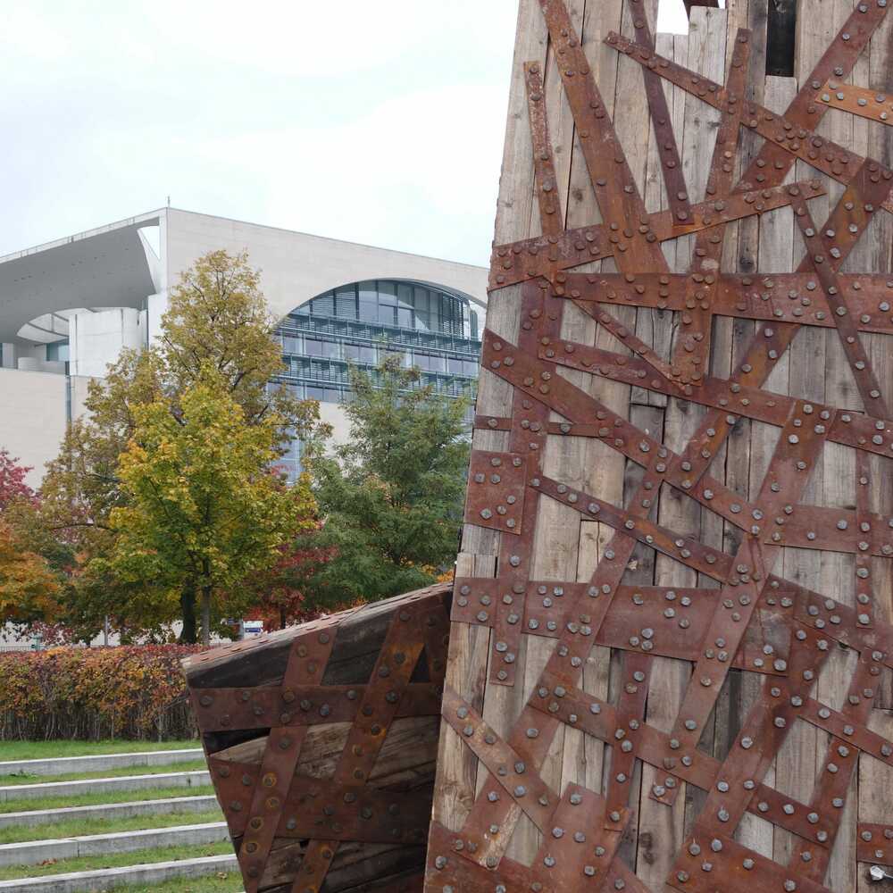 Aktions-Skulptur aus Holzbalken, Schmiedenägel, Blechstreifen. Performance in Zusammenarbeit mit über 100 Geflüchteten aus unterschiedlichen Teilen der Welt.