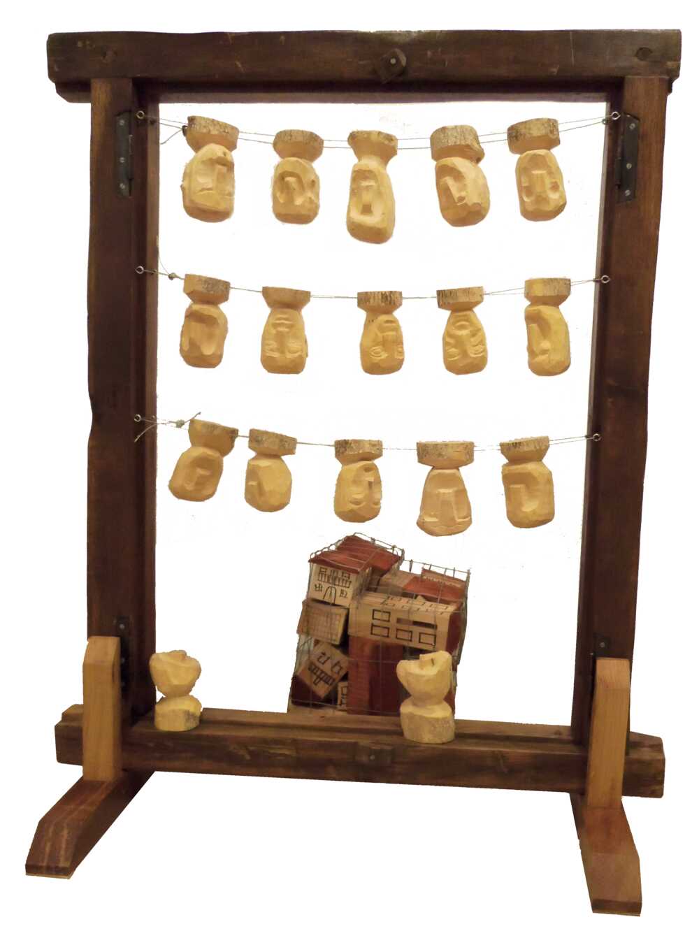 Trabajo abstracto en el que se emplea madera de roble, boj y pino. El marco hace de marco, valga la redundancia. Se talla en basto cabezas de persona con expresiones distintas. Unas de ellas están colgadas boca abajo con una sirga de lado a lado del marco en dos hileras.