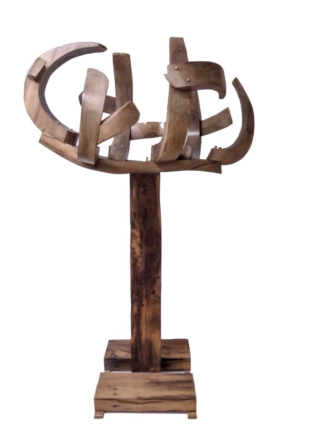 De estilo abstracto se utiliza madera de roble vieja y de nogal. Base con vástago de roble y figura principal con maderas de nogal cortadas en curvatura y unidas a un eje con tubillones de haya y encolado. Acabado con lija y encerado el roble. El nogal con aceite de linaza. Se genera una forma ovalada quedando un vacío en el interior que da una sensación de seguridad.
