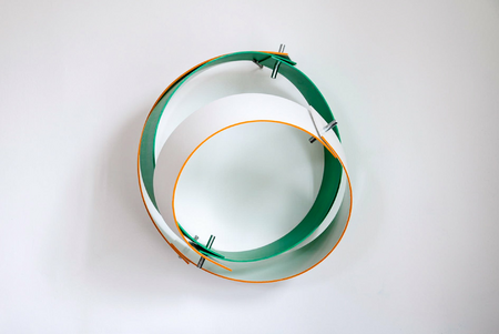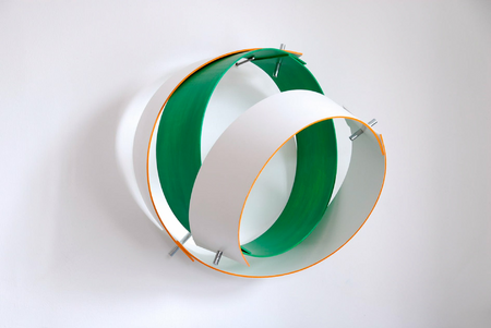 The cool plain white stripes with the orange thin edges contrast to the green stripes which gives the sculpture a fresh and dynamic expression.