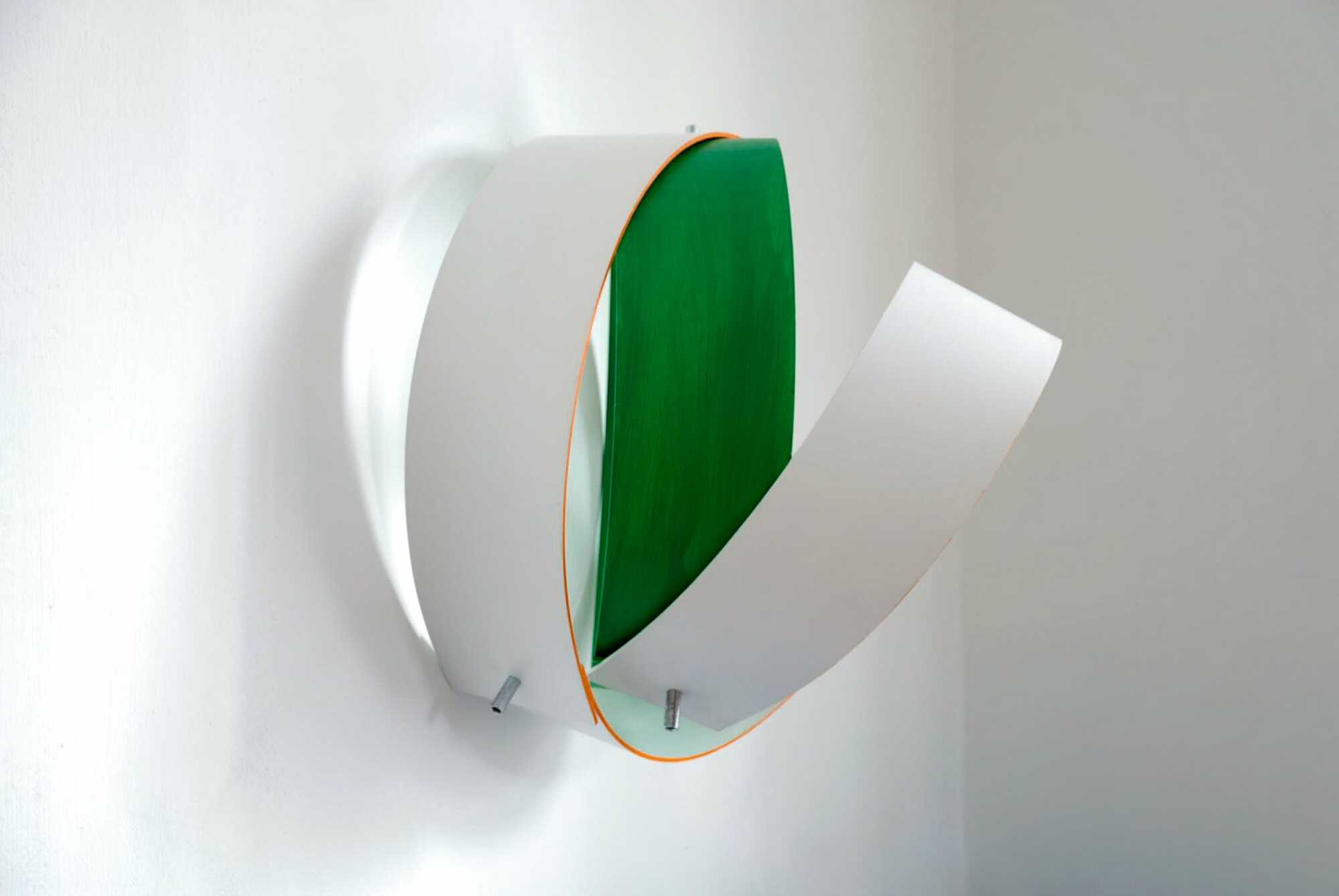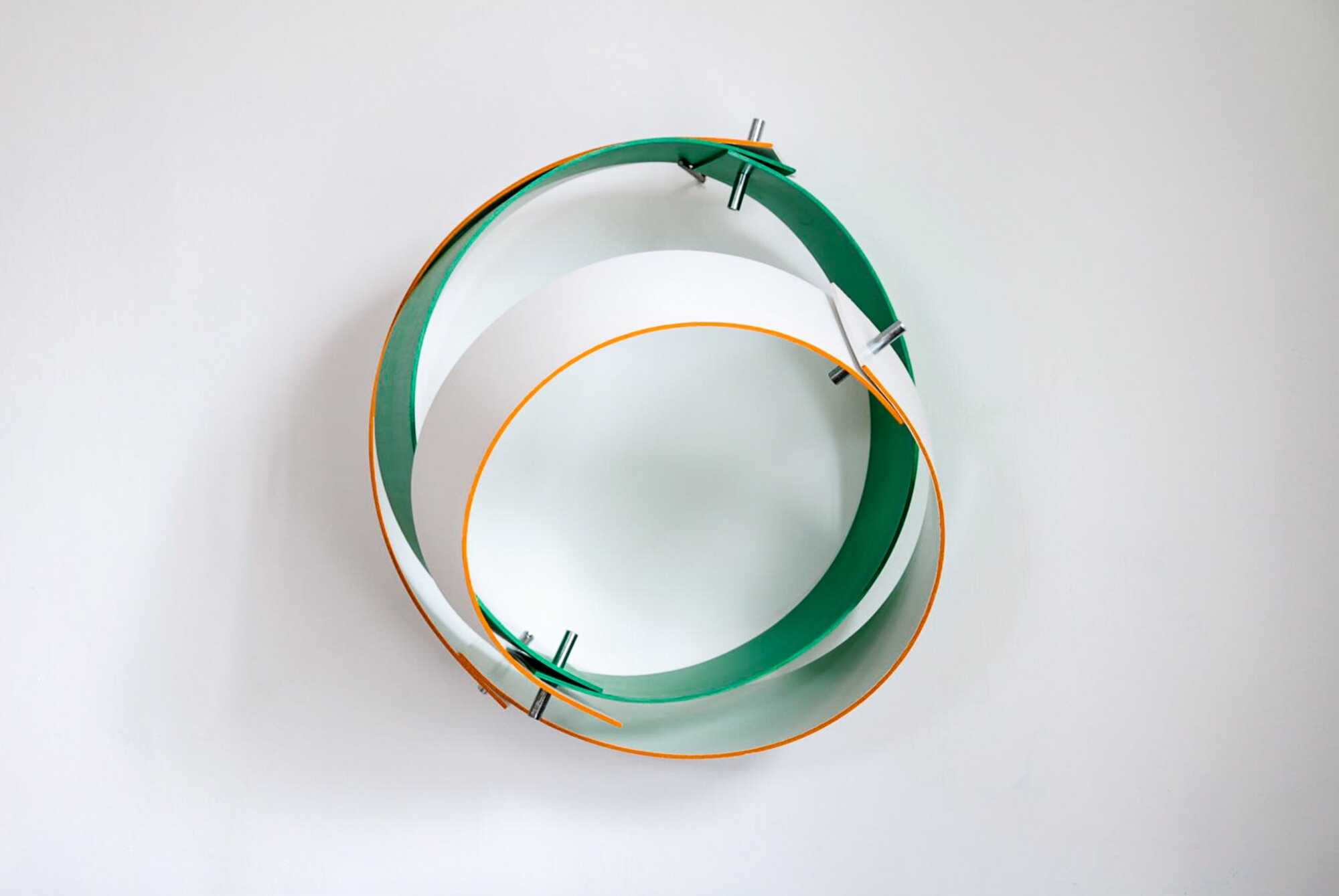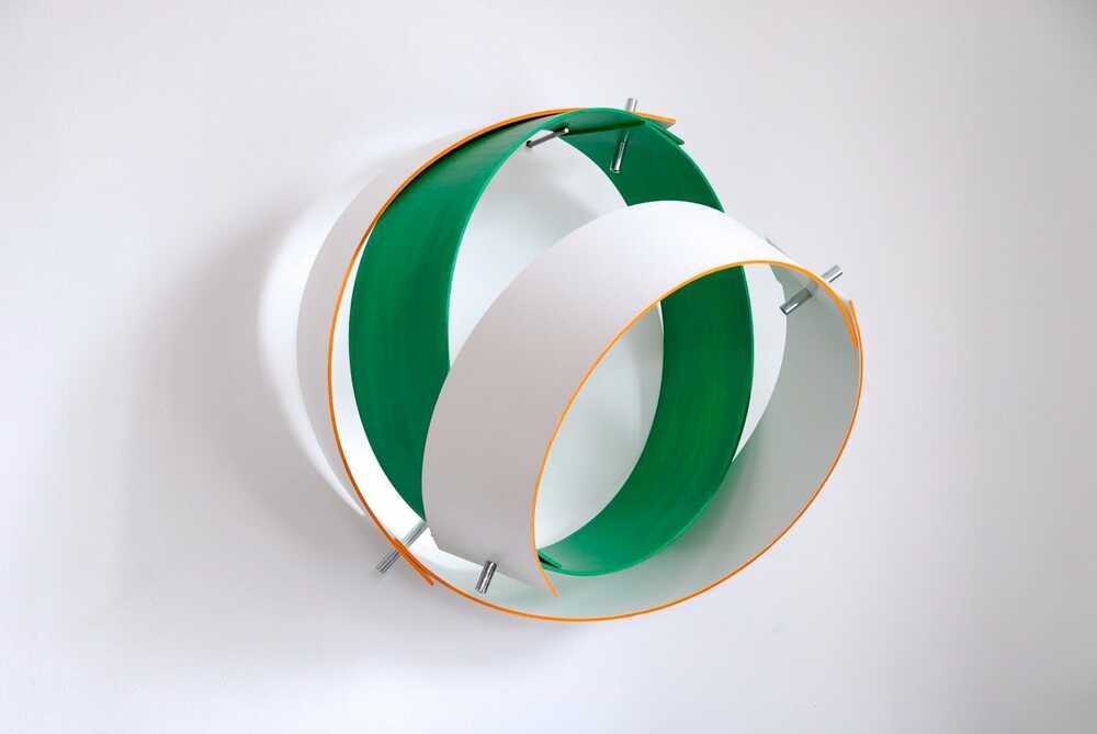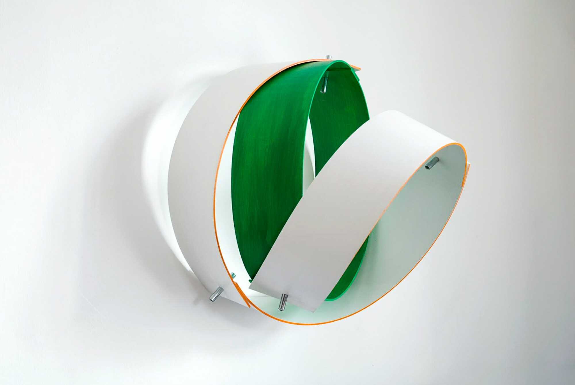 Die kĂĽhlen weiĂźen Streifen mit den orangefarbenen dĂĽnnen Kanten kontrastieren mit den grĂĽnen Streifen, die der Skulptur einen frischen und dynamischen Ausdruck verleihen.