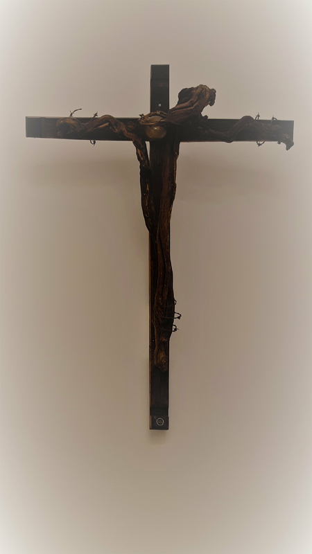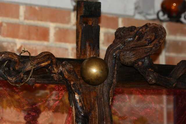 Das Winzerkreuz stellt eine Komposition aus Fassdauben und zwei ineinander verschlungenen Weinstöcken mit dem Kopf, einer mit Acryllack bemalten Niro Kugel als Kopf des gekreuzigten Heilands dar.