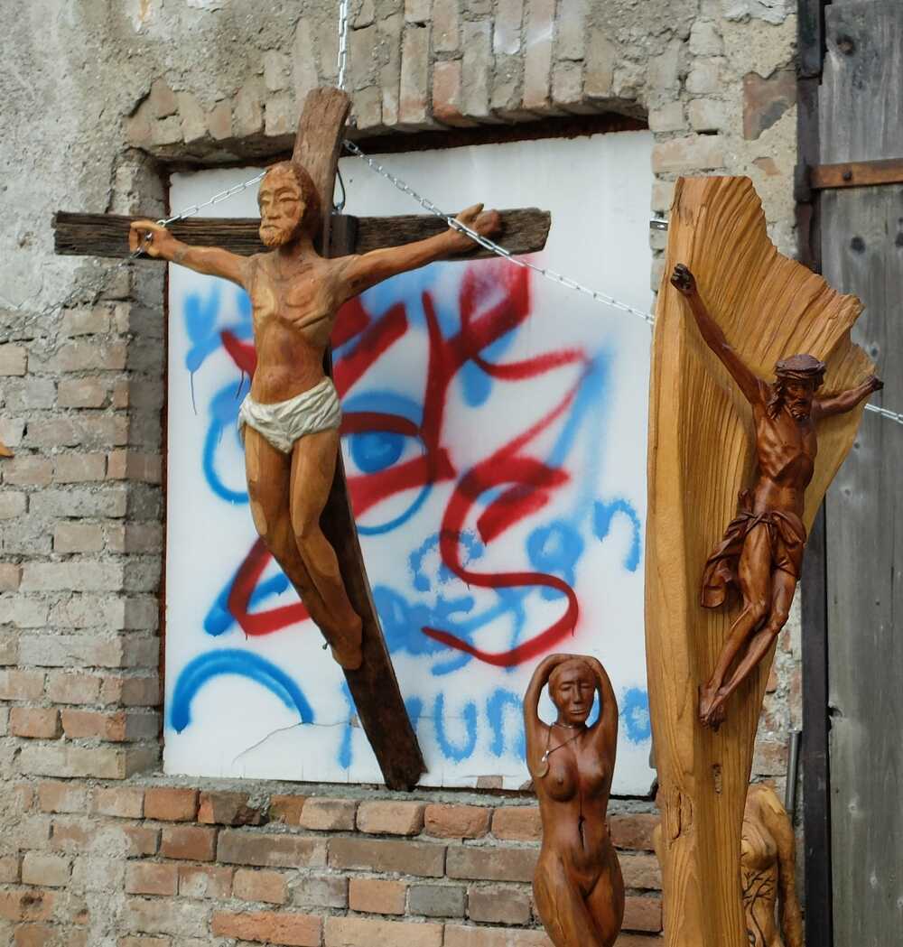 Dieses Werk (hier zu sehen bei der Ausstellung am Korneuburger Höfefest 2018 - mit zufällig vorhandenem Hintergrund) entstand aus zwei Fassdauben (Kreuz) und einem Marillenbaum aus Stockerau