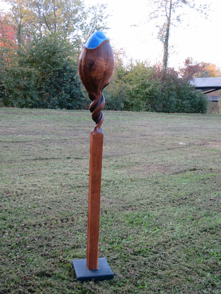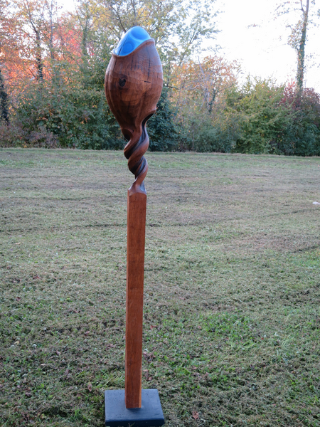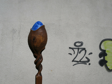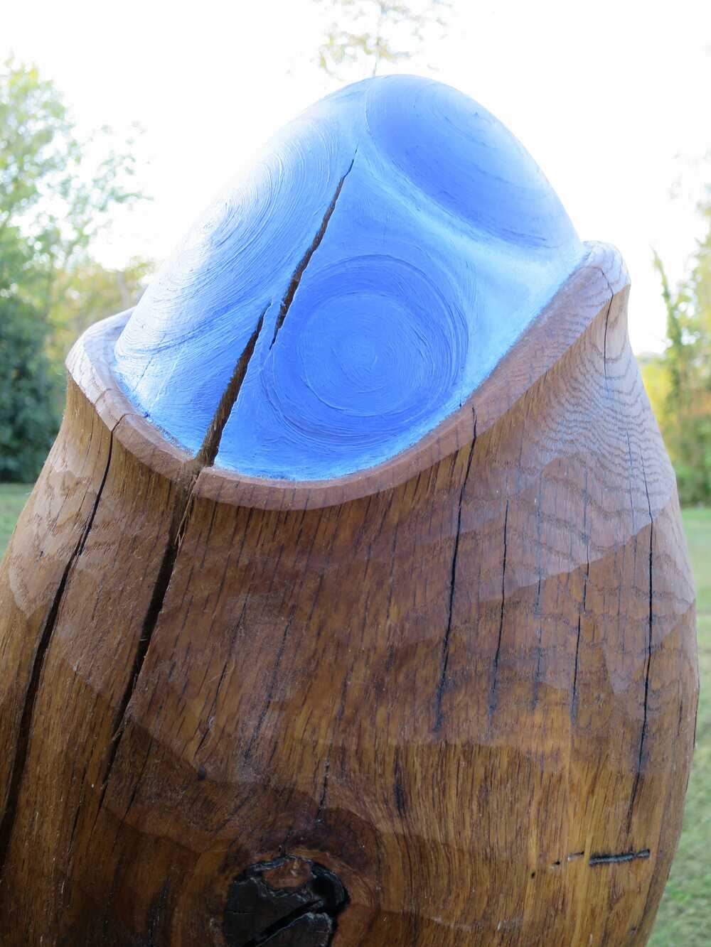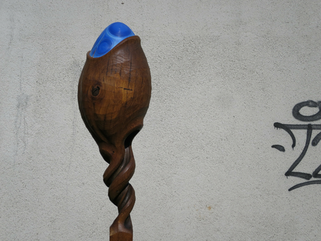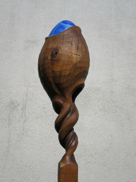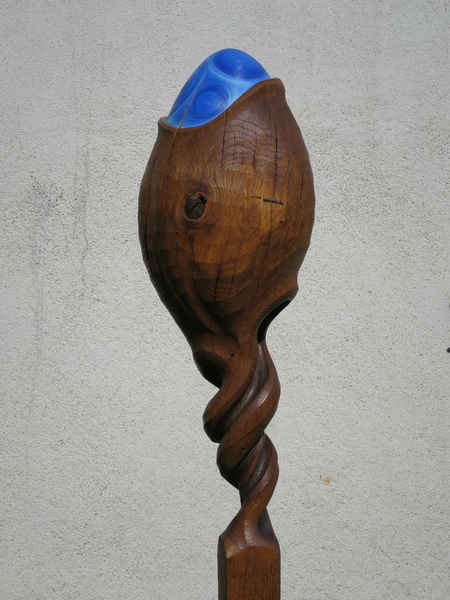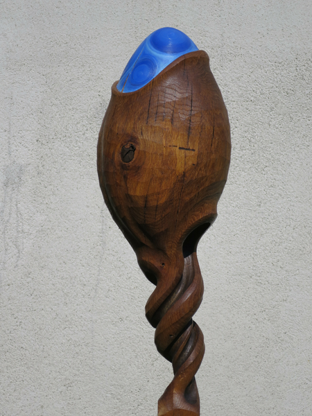 Aus Eichenstamm gehauen geölt, mit Ölfarben bemalt, auf Beton Fusssockel.