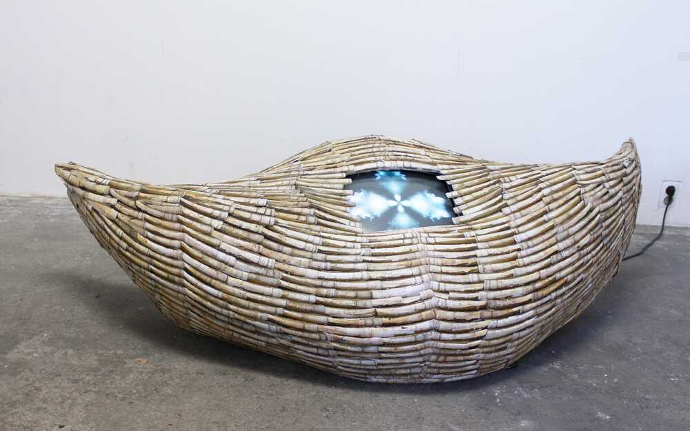 Organic media sculpture - Skulptur mit einer Haut oder Panzer aus Schwertmuscheln und einem Fernsehmonitor mit Wasserstrukturen / sculpture with sword shell skin and video monitor displaying ocean textures