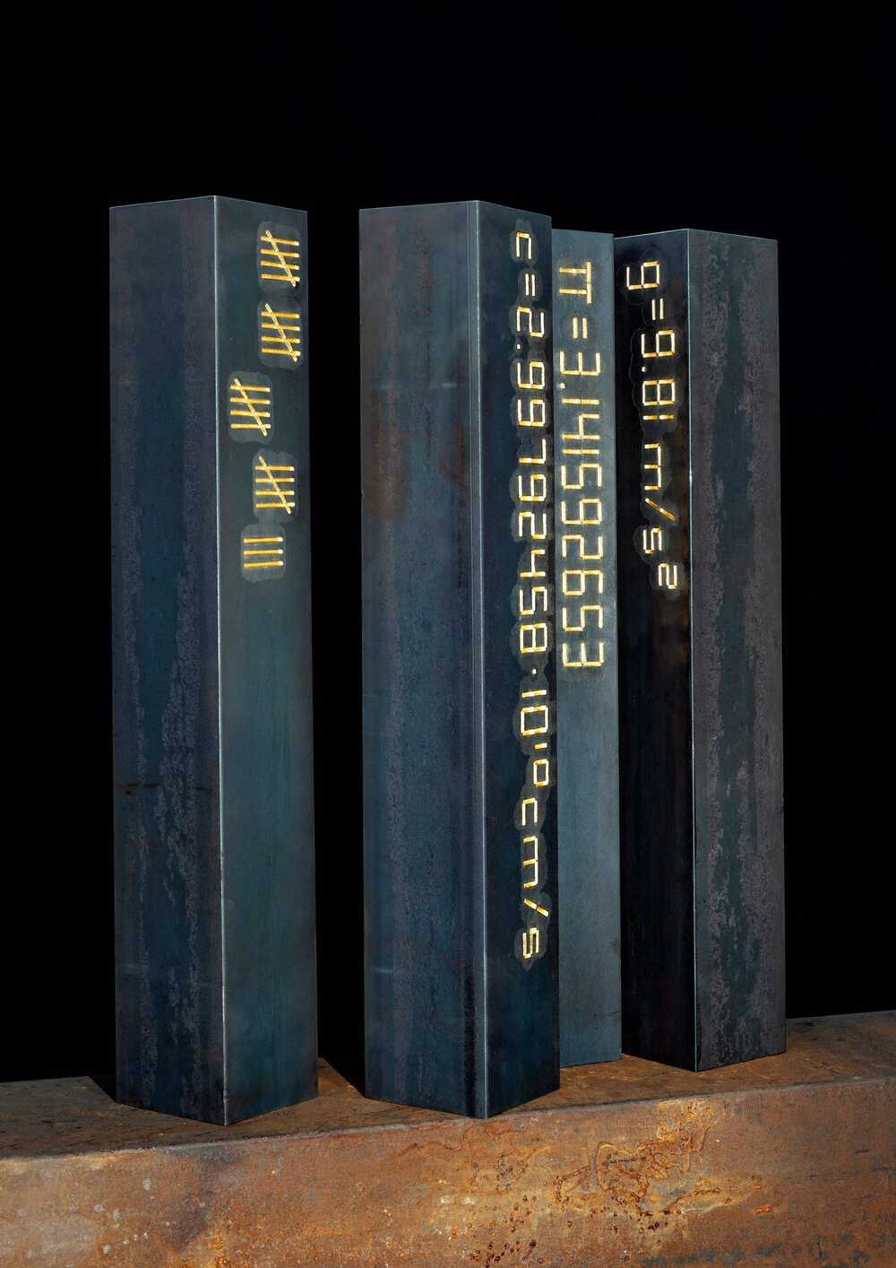 (Tally, Speed of Light, Pi, Speed of Earth) from the cycle Iron Age, 63.5 x 10 x 10 cm each, exactly 50 kg each, solid structural steel, cold hallmarked, gold-plated.